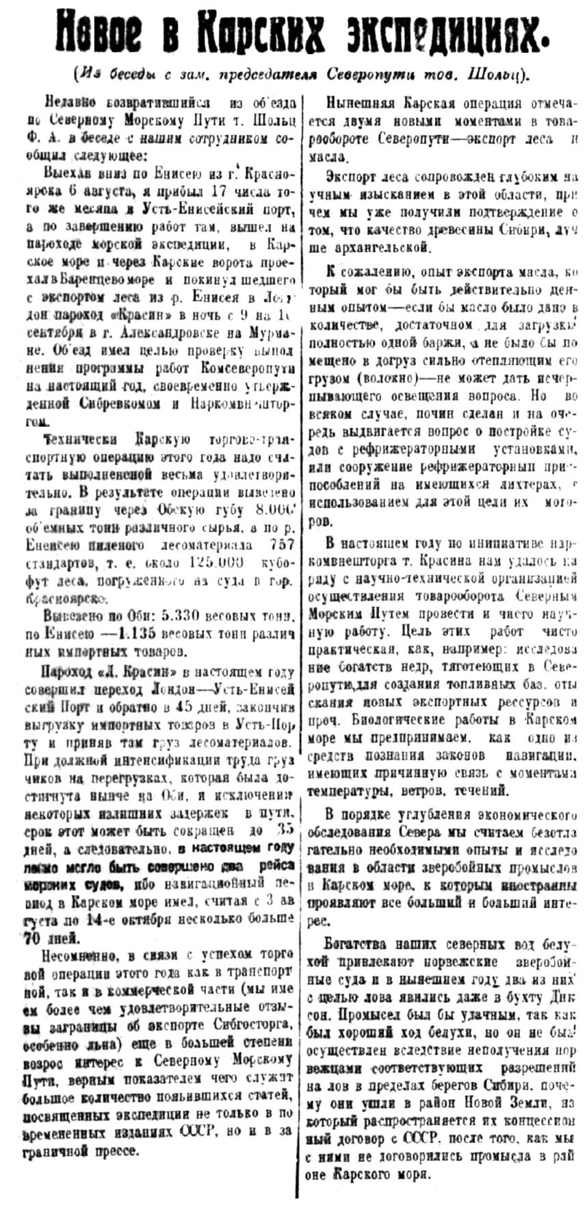 В 1924 г. встал вопрос об экспорте из Сибири лесоматериалов. Раньше такой вопрос не возникал, так как Карский морской путь еще не был реальным для экспортных операций. Теперь опыт убедительно показал жизнеспособность Карского морского пути, причем фрахт, страхование грузов и другие расходы по Карской экспедиции из года в год снижались. Следовательно, Карский морской путь имел перспективу стать дешевым.