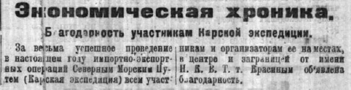Карская экспедиция 1924 г., по сравнению с операциями предыдущих лет, имела ряд положительных сторон. Экспедицией были выдержаны сроки, установленные Комитетом Северного морского пути. Пароход «Л. Красин» потратил на плавание туда и обратно, включая время на перегрузку, всего 48 дней. Пароход «Аркос» вернулся в Лондон на неделю позже, затратив на плавание 55 дней. Переход к месту назначения занял у «Аркоса» 17 дней, у «Л. Красина» – 19 дней. Обратно «Аркос» шел 14 дней, «Л. Красин» – 16 дней. В прошлые годы плавание тех же судов в устья западносибирских рек продолжалось: в 1921 г. в среднем 24 дня, в 1922 г. – 25 дней, в 1923 г. – 24 дня. Суда прошлых Карских экспедиции отправлялись в плавание приблизительно в тот же срок что и в 1924 г., т. е. между 30 июля и 2 августа, но возвращались в английские порты намного позднее – 4–12 октября. Речные суда в 1924 г. также прибыли к местам разгрузки в точно намеченные сроки. Все это убедительно подтверждало, что Карский морской путь не только пригоден для коммерческой эксплуатации, но при умелой организации может использоваться планомерно, как обычная транспортная магистраль.