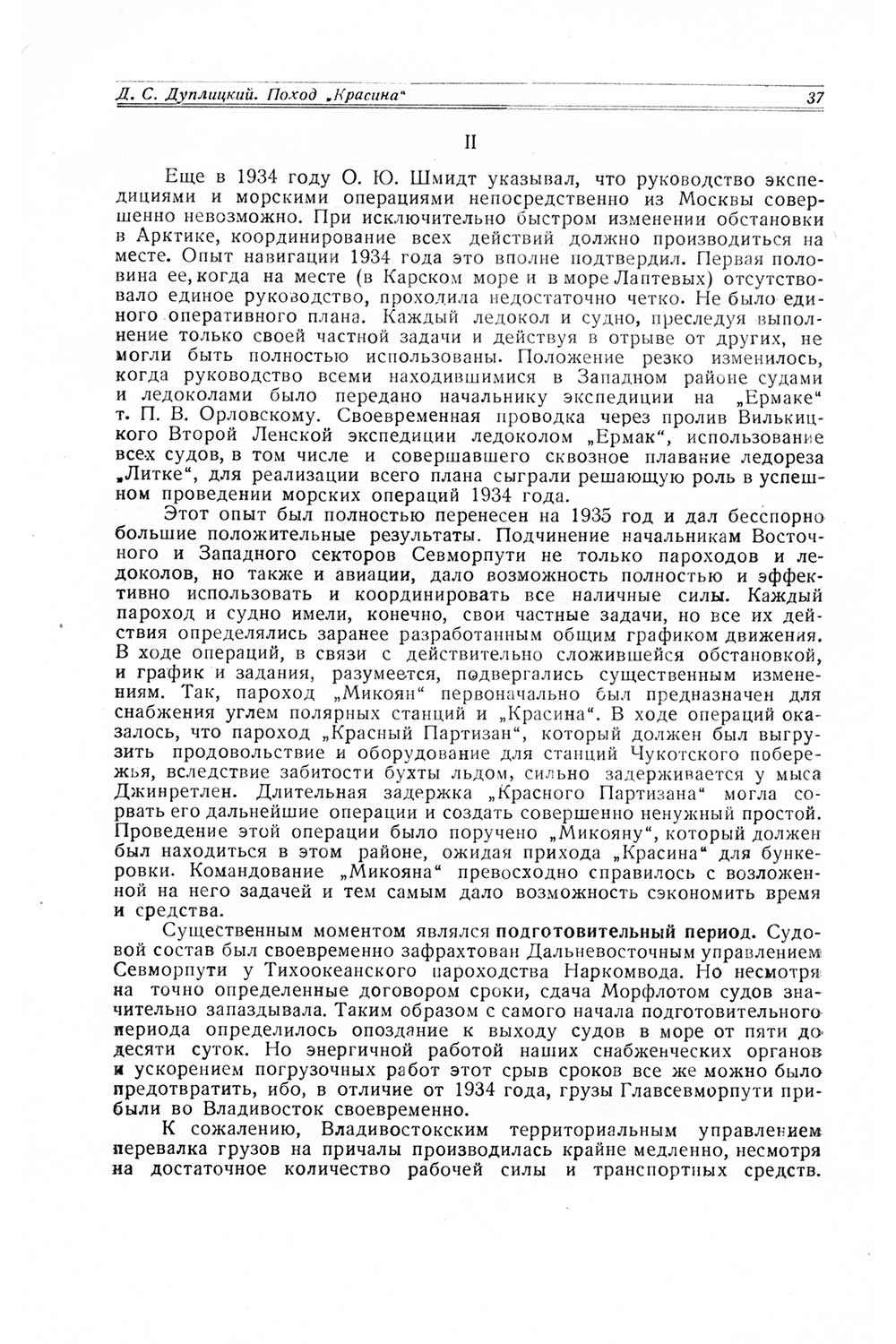 Существенным моментом являлся подготовительный период. Судовой состав был своевременно зафрахтован Дальневосточным управлением Севморпути у Тихоокеанского пароходства Наркомвода. Но несмотря на точно определенные договором сроки, сдача Морфлотом судов значительно запаздывала. Таким образом с самого начала подготовительного периода определилось опоздание к выходу судов в море от пяти до десяти суток. Но энергичной работой наших снабженческих органов и ускорением погрузочных работ этот срыв сроков все же можно было предотвратить, ибо, в отличие от 1934 года, грузы Главсевморпути прибыли во Владивосток своевременно.