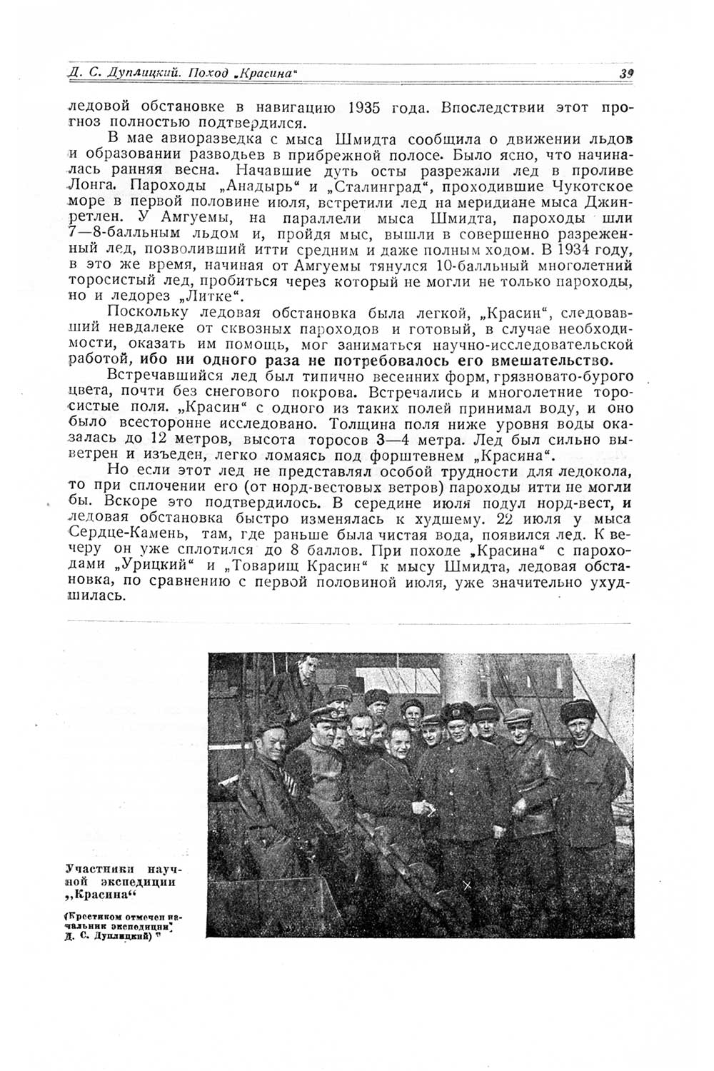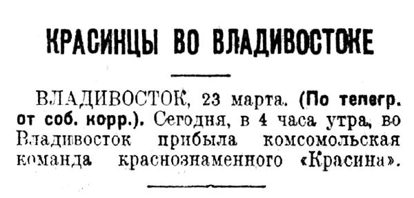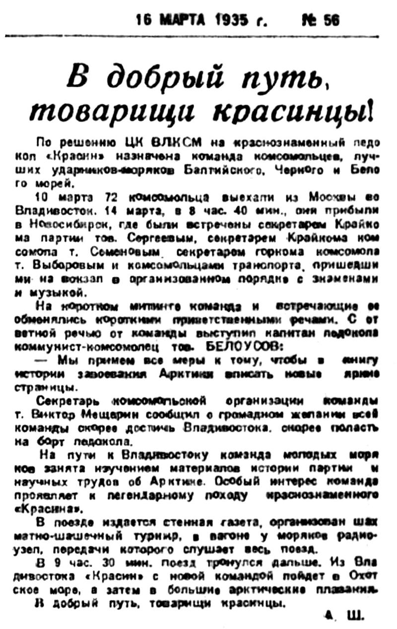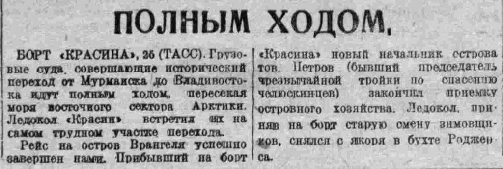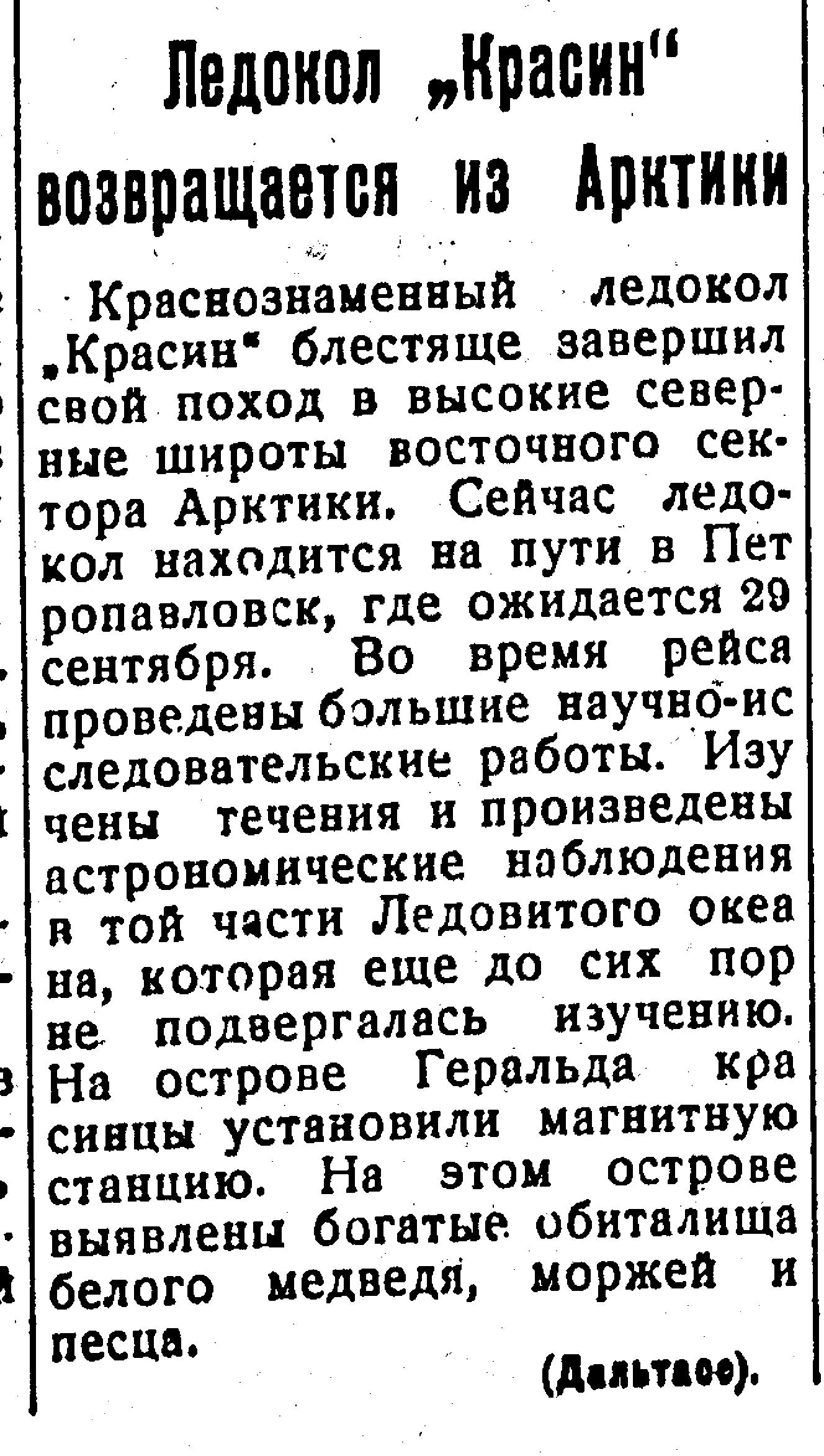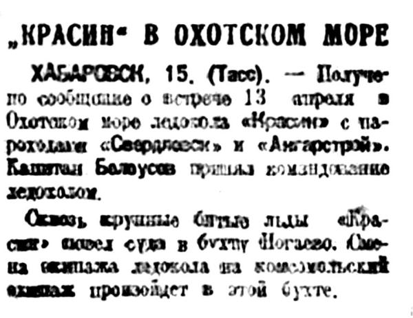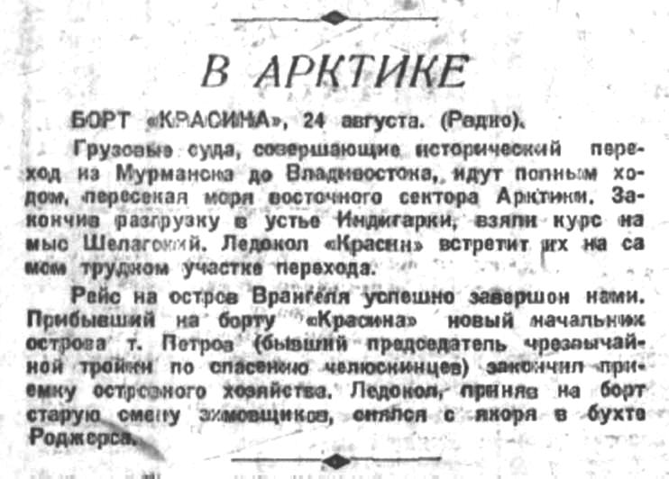 Несмотря на отсутствие у капитанов пароходов навыков следовать за ледоколом, так как до 1934 года мощного ледокола на Дальнем Востоке вообще не было, проводка судов „Красиным" проходила успешно и значительно ускорила продвижение судов.
