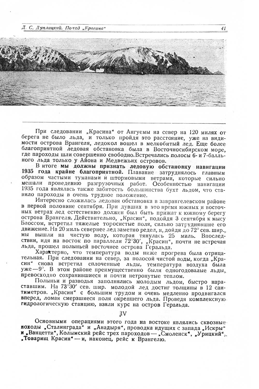Наиболее тяжелым участком следует считать среднюю часть пролива, где льды были наиболее сплоченными и сохранившимися. По этой части пролива пароходы самостоятельно итти не могут. Но при наличии мощного ледокола вопрос о проводке судов через пролив Лонга полностью был разрешен. „Красин" вывел „Микояна" из ледяного поля восточнее мыса Шмидта и, идя иод семью котлами вместо десяти, все же свободно вел за собой „Микояна", делая по две мили в час.