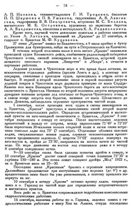 За три слишком месяца плавания „Красина" было взято 74 комплексных гидрологических станции, произведено более 2 тысяч анализов воды, определены сотни температур, глубин, поставлены три астрономических пункта, определены 10 магнитных пунктов и т. д.