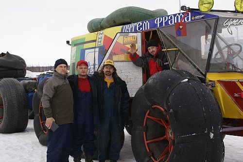 Произошла масса интереснейших событий, начиная с того, что при форсировании ледовой переправы через реку Пур к Уренгою, нагрузки на прицеп добили его ходовую и пройдя еще несколько километров по трассе, ось прицепа отломилась вместе с колесом. В приближающейся ночи кипела работа по замене колеса на кусок березы, отпиленной в лесу бензопилой, как бы случайно оказавшейся у нас в кузове :)