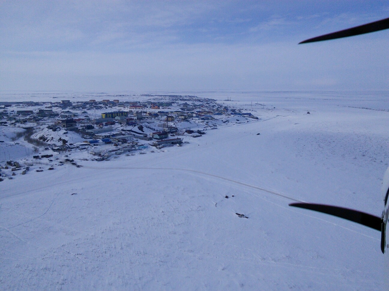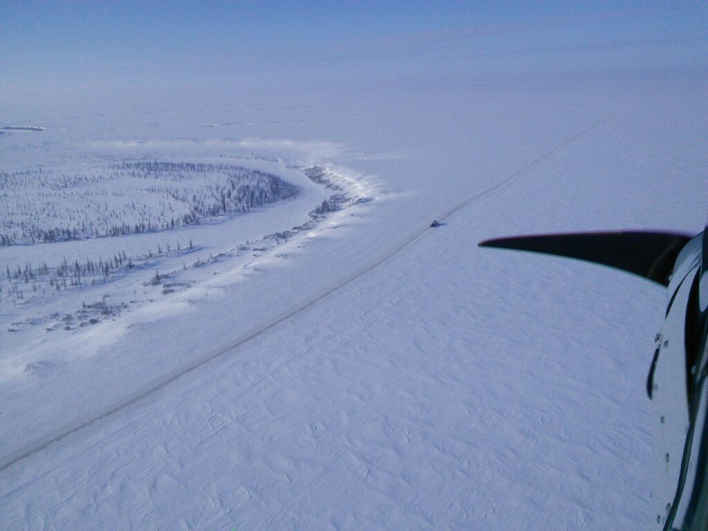 Итак, в воскресенье в Пасху уже ближе к вечеру произвел первый вылет с участка наста, протоптанного мне вездеходом. Оказалось, что величины ограничительных тросов, хода лыжи самолета, в Подмосковье и Ямале сильно разнятся