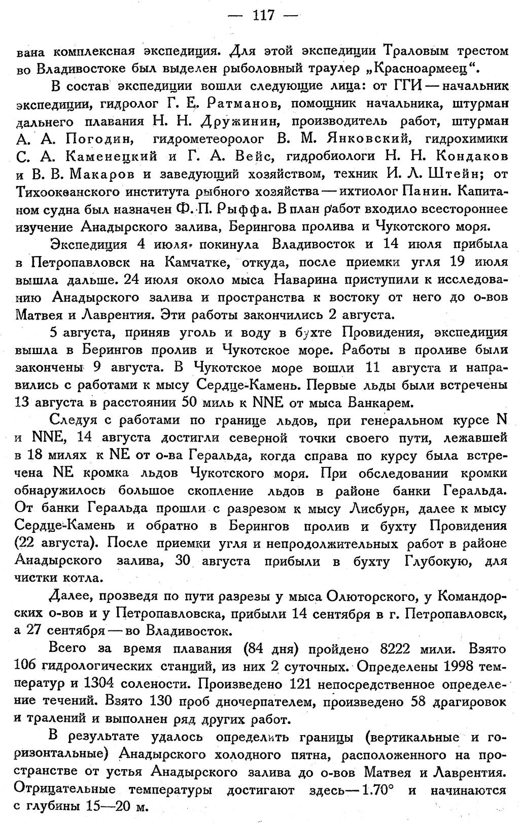 Далее, произведя по пути разрезы у мыса Олюторского, у Командорских о-вов и у Петропавловска, прибыли 14 сентября в г. Петропавловск, а 27 сентября — во Владивосток.