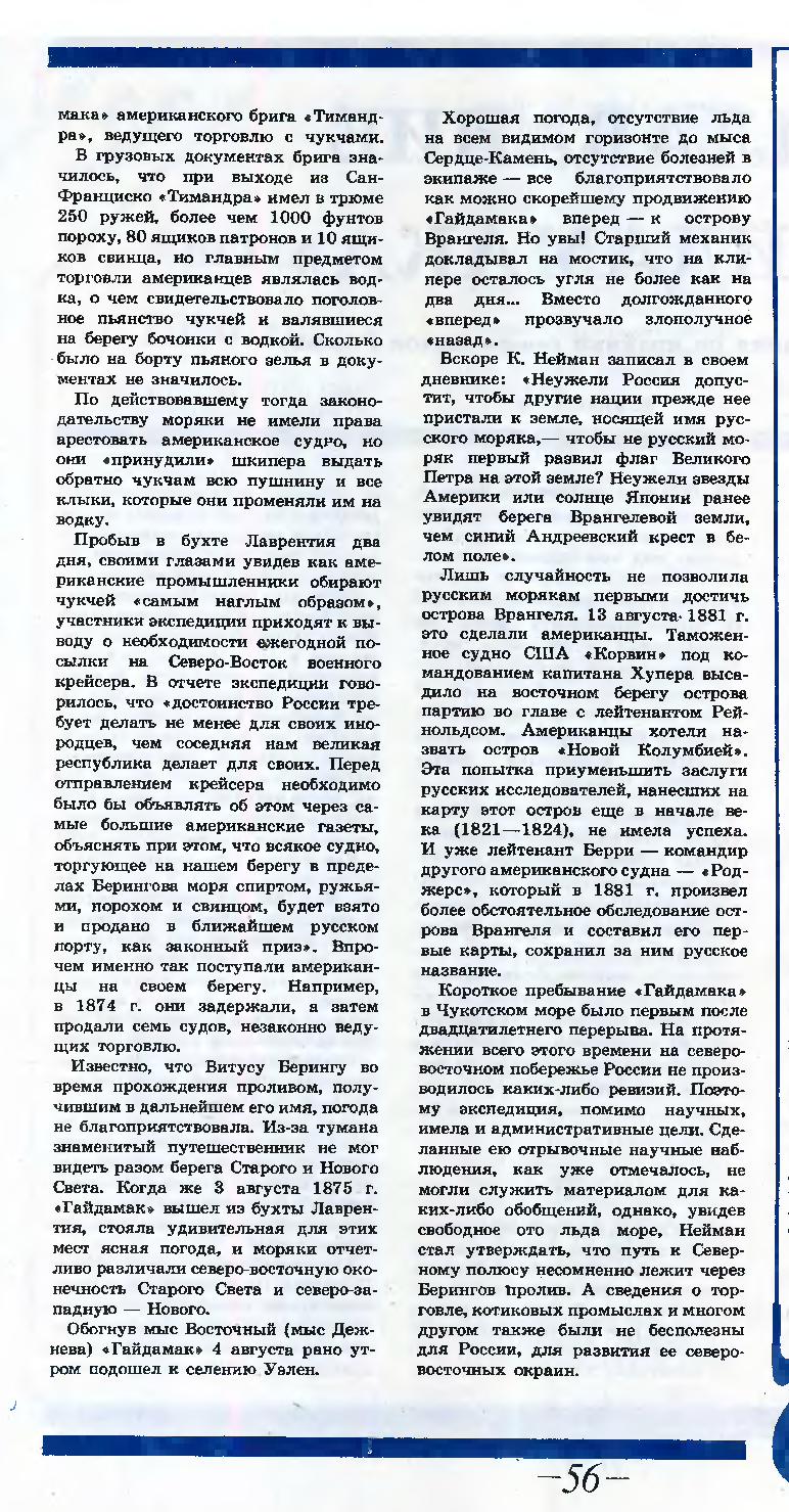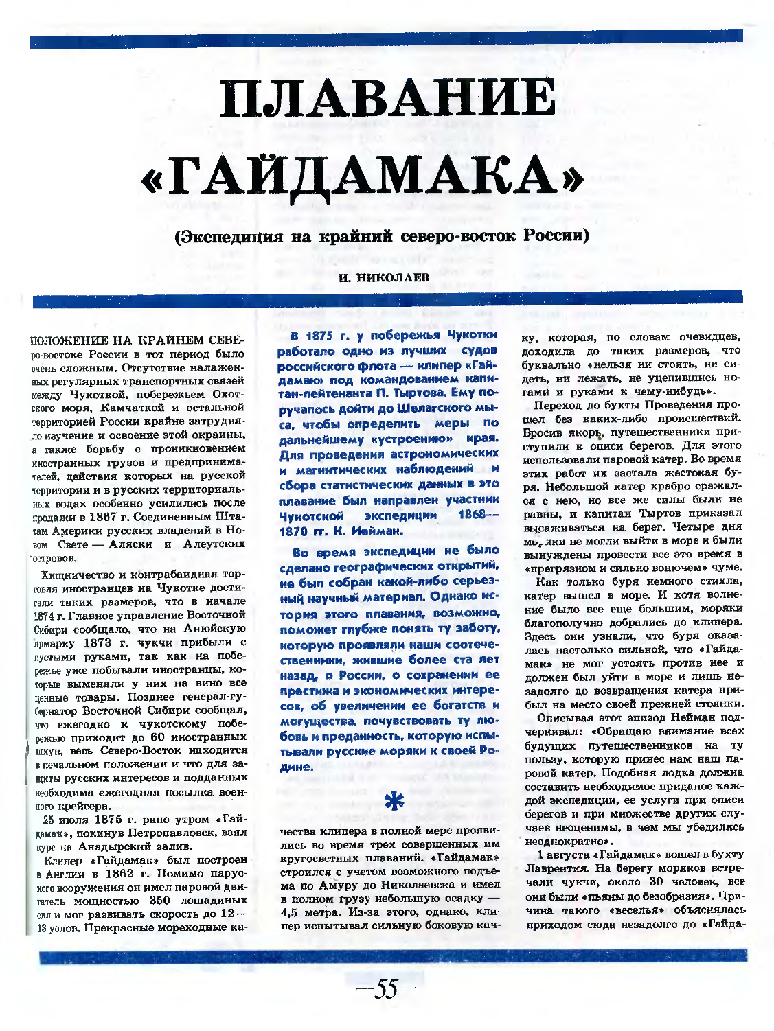 В 1875 г. у побережья Чукотки работало одно из лучших судов российского флота — клипер «Гайдамак» под командованием капитан-лейтенанта П. Тыртова. Ему поручалось дойти до Шелагского мыса, чтобы определить меры по дальнейшему «устроению» края. Для проведения астрономических и магнитических наблюдений и сбора статистических данных в это плавание был направлен участник Чукотской экспедиции 1868— 1870 гг. К. Иейман.
