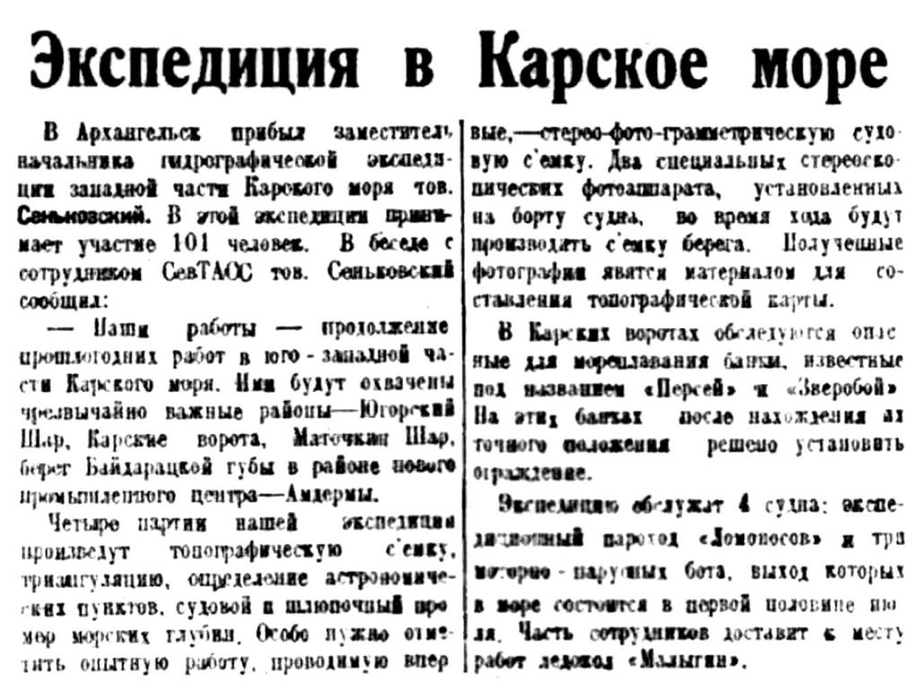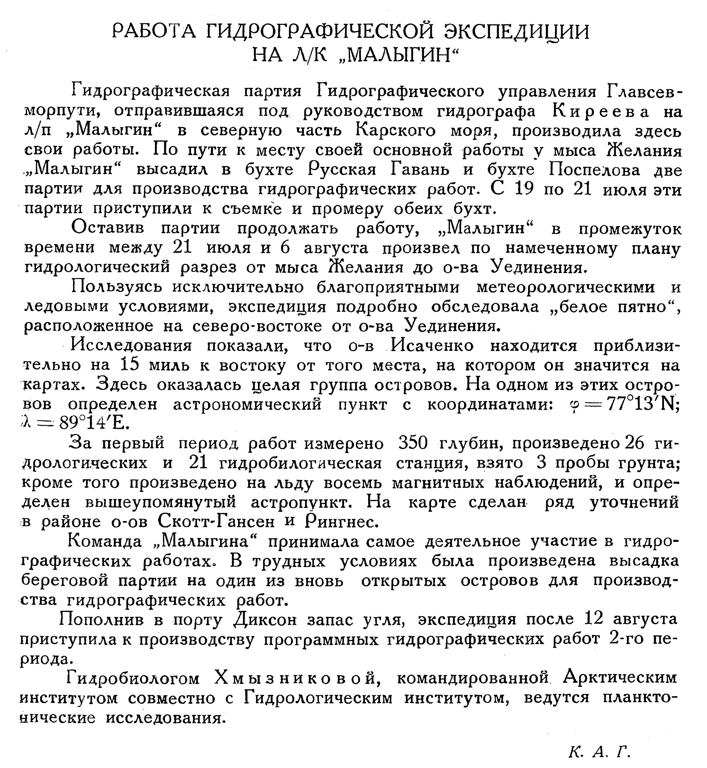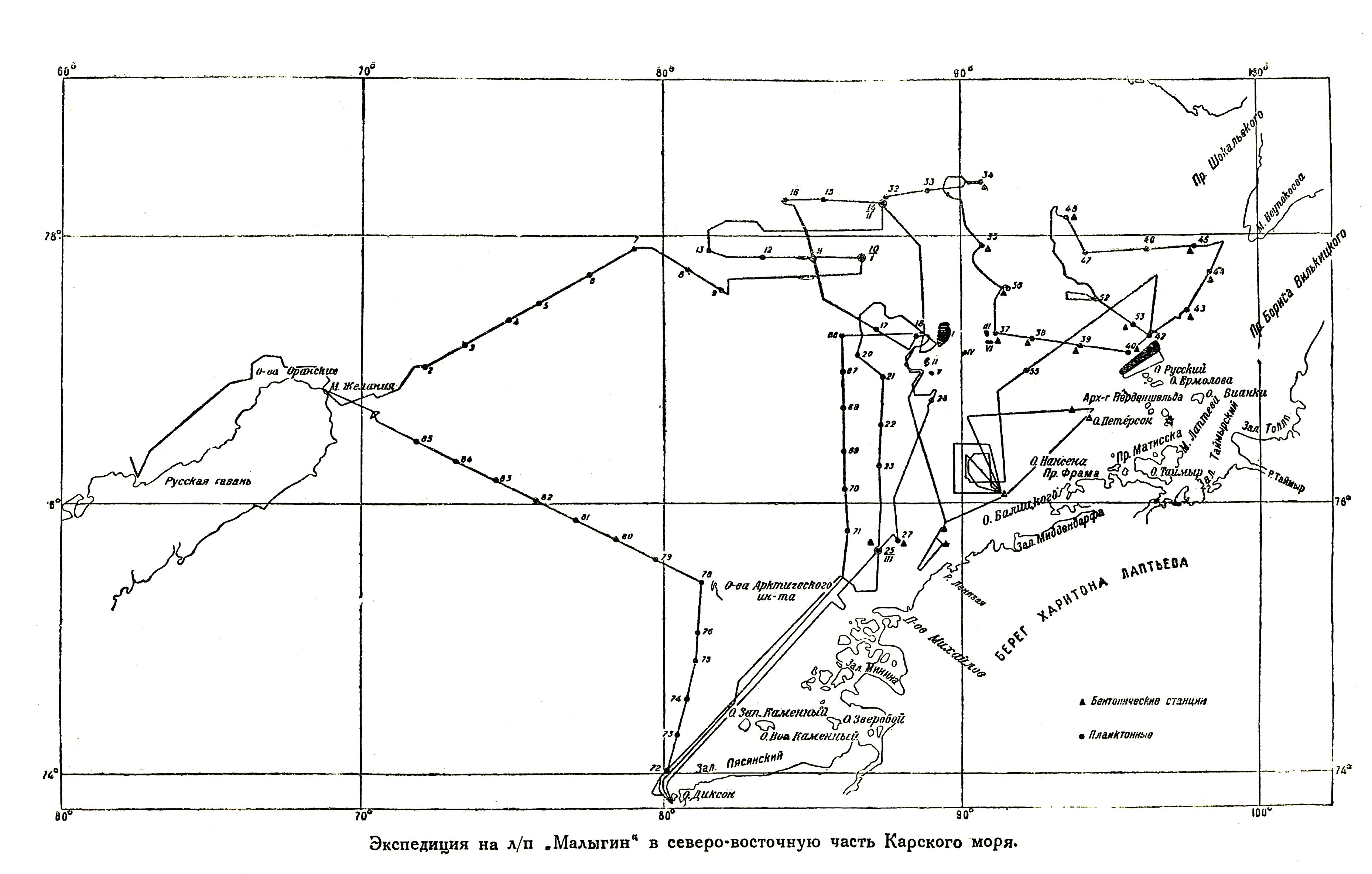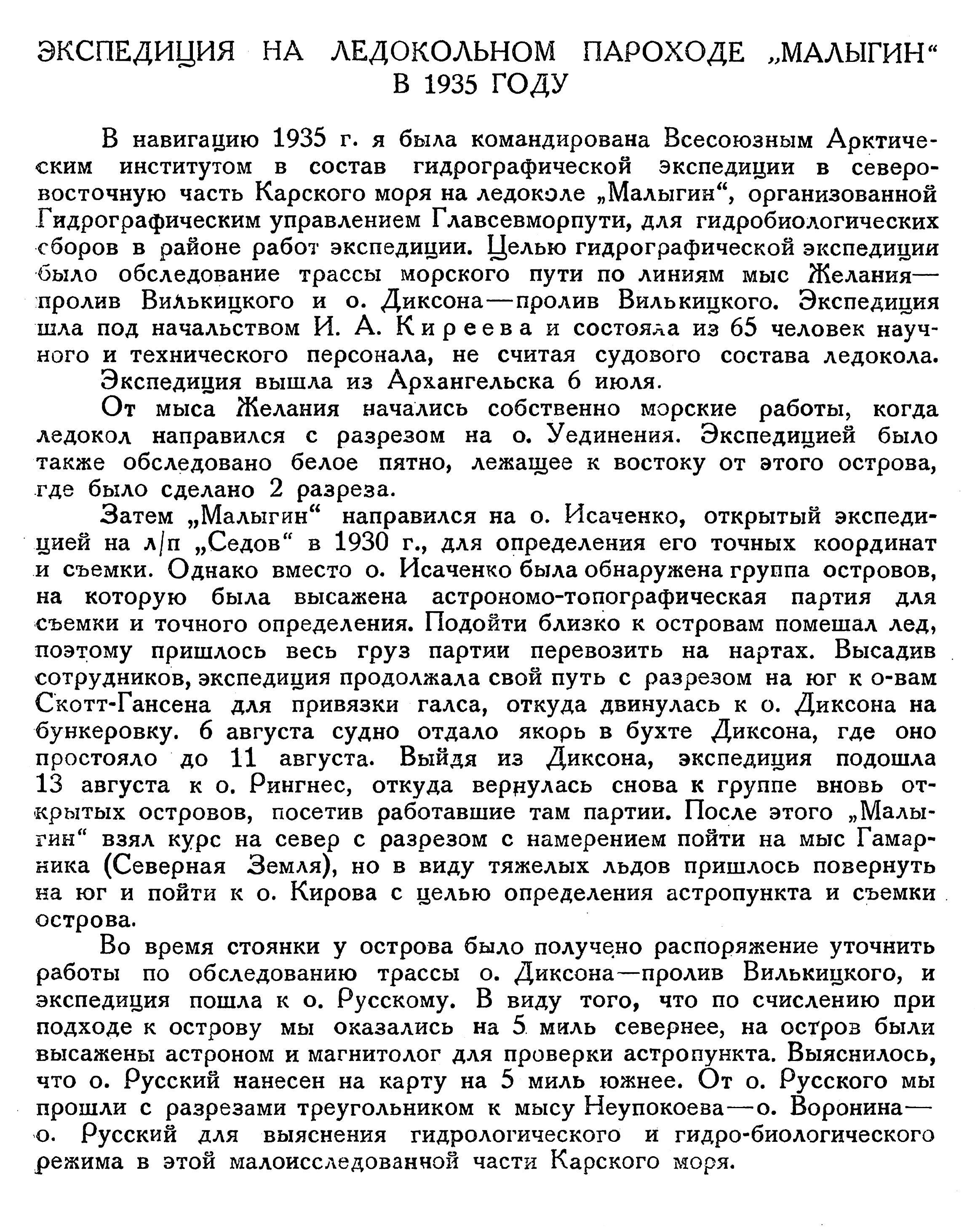 В навигацию 1935 г. я была командирована Всесоюзным Арктическим институтом в состав гидрографической экспедиции в северо-восточную часть Карского моря на ледоколе "Малыгин", организованной Гидрографическим управлением Главсевморпути, для гидробиологических сборов в районе работ экспедиции. Целью гидрографической экспедиции было обследование трассы морского пути по линиям мыс Желания — пролив Вилькицкого и о. Диксона — пролив Вилькицкого. Экспедиция шла под начальством