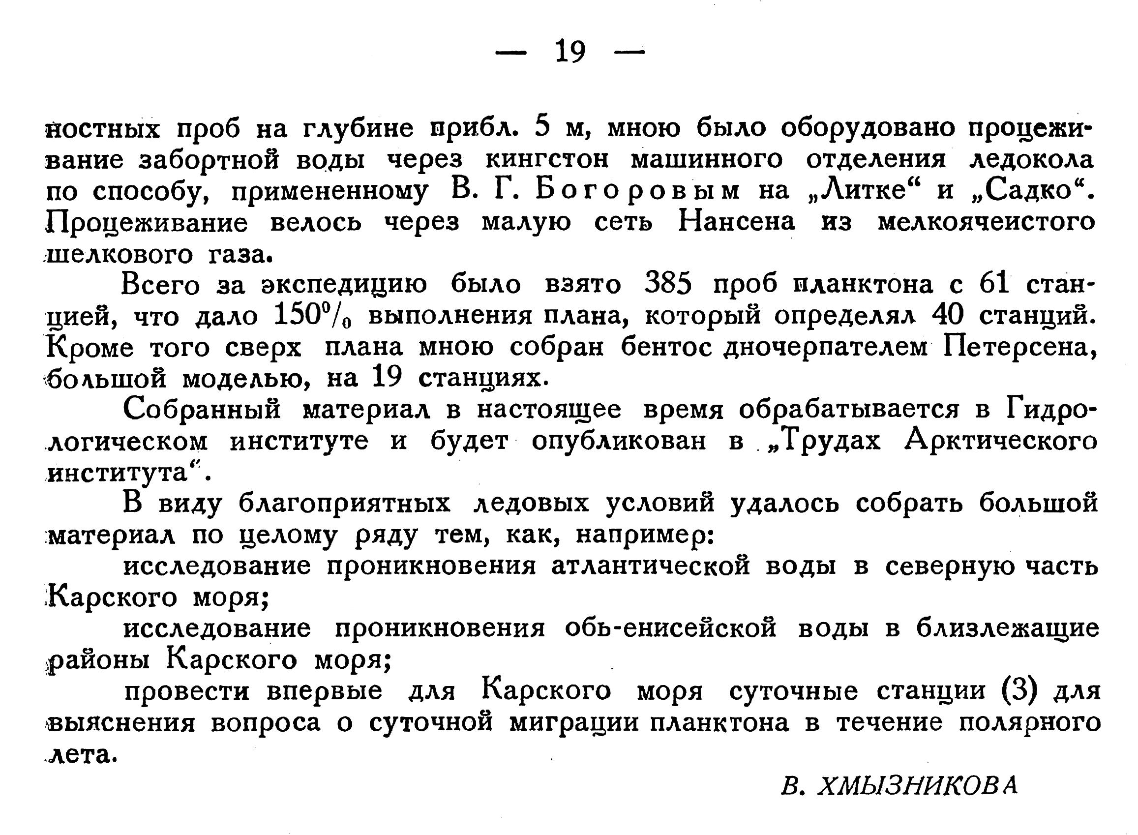 Собранный материал в настоящее время обрабатывается в Гидрологическом институте и будет опубликован в "Трудах Арктического института".