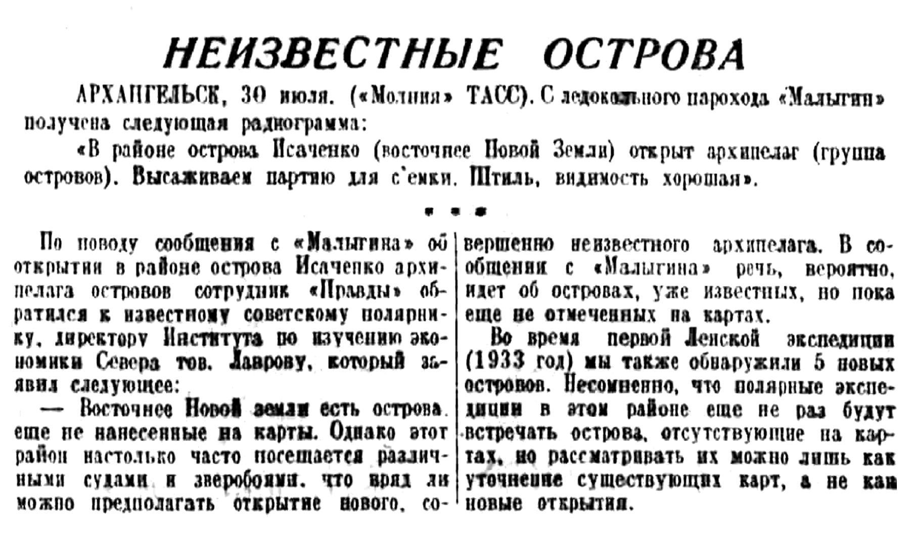 Затем "Малыгин" направился на о. Исаченко, открытый экспедицией на л/п "Седов" в 1930 г., для определения его точных координат и съемки. Однако вместо о. Исаченко была обнаружена группа островов, на которую была высажена астрономо-топографическая партия для съемки и точного определения. Подойти близко к островам помешал лед, поэтому пришлось весь груз партии перевозить на нартах. Высадив сотрудников, экспедиция продолжала свой путь с разрезом на юг к о-вам Скотт-Гансена для привязки галса, откуда двинулась к о. Диксона на бункеровку. 6 августа судно отдало якорь в бухте Диксона, где оно простояло до 11 августа. Выйдя из Диксона, экспедиция подошла 13 августа к о. Рингнес, откуда вернулась снова к группе вновь открытых островов, посетив работавшие там партии. После этого "Малыгин" взял курс на север с разрезом с намерением пойти на мыс Гамарника (Северная Земля), но в виду тяжелых льдов пришлось повернуть на юг и пойти к о. Кирова с целью определения астропункта и съемки острова.
