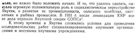 мало, но важно было положить начало. И то, что удалось сделать, сыграло огромную положительную роль в социалистическом переустройстве Якутии, в развитии ее промышленности, сельского хозяйства, охотничьих и рыбных промыслов. В 1931 г. после ликвидации КЯР все ее дела перешли Якутской секции СОПСа {1}.