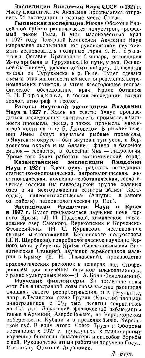 Подводя итог всему сказанному, нужно перечислить следующие экспедиции, осуществляемые в текущем году Академией Наук: Персидская по изучению книжного дела под руководством Ю. Н. Марра; Забайкальская зоологическая — Б. С. Виноградова; Байкальская, вновь начавшая свою прерванную войной деятельность, — Г. Ю. Верещагина; Крымская (калиевая) — академика Н. С. Курнакова; Туркестанская — А. В. Мартынова; по изучению флоры Кавказа — Н. А. Буша; Беломорская — А. Н. Лабунцова; Новоземельская — П. В. Виттенбурга и наконец,— Черноморская экспедиция — В. Н Никитина.