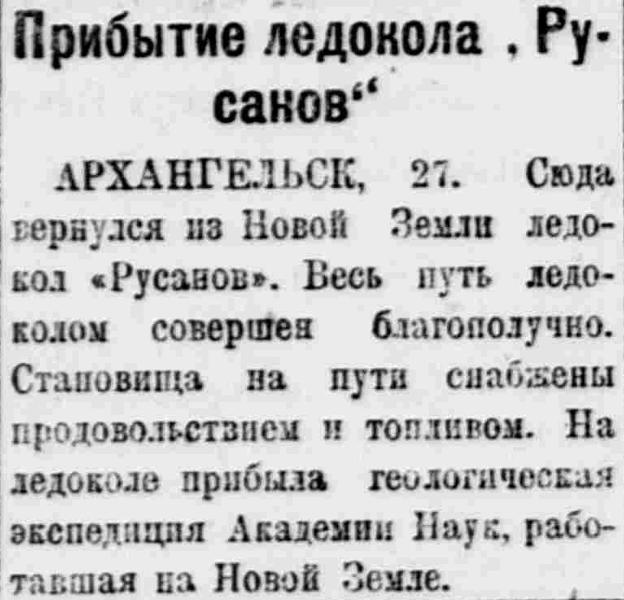 АРХАНГЕЛЬСК, 27. Сюда вернулся из Новой Земли ледокол "Русанов". Весь путь ледоколом совершен благополучно. Становища на пути снабжены продовольствием и топливом. На ледоколе прибыла геологическая экспедиция Академии Наук, работавшая на Новой Земле.