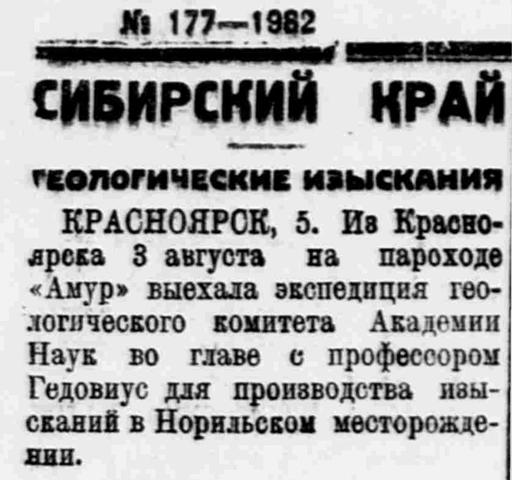 КРАСНОЯРСК, 5. Из Красноярска 3 августа на пароходе «Амур» выехала экспедиция геологического комитета Академии Наук во главе с профессором Гедовиус для производства изысканий в Норильском месторождении.