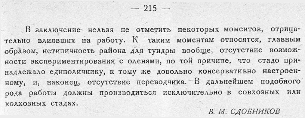 В заключение нельзя не отметить некоторых моментов, отрицательно влиявших на работу. К таким моментам относятся, главным образом, нетипичность района для тундры вообще, отсутствие возможности экспериментирования с оленями, по той причине, что стадо принадлежало единоличнику, к тому же довольно консервативно настроенному, и, наконец, отсутствие переводчика. В дальнейшем подобного рода работы должны производиться исключительно в совхозных или колхозных стадах.