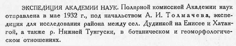 ЭКСПЕДИЦИЯ АКАДЕМИИ НАУК. Полярной комиссией Академии наук отправлена в мае 1932 г., под начальством А. И. Толмачева, экспедиция для исследования района между сел. Дудинкой на Енисее и Хатангой, а также р. Нижней Тунгуски, в ботаническом и геоморфологическом отношениях.
