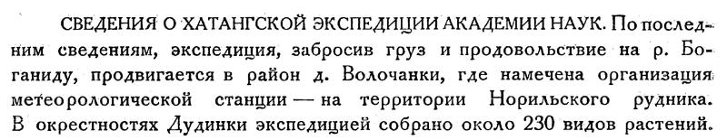 СВЕДЕНИЯ О ХАТАНГСКОЙ ЭКСПЕДИЦИИ АКАДЕМИИ НАУК. По последним сведениям, экспедиция, забросив груз и продовольствие на р. Боганиду, продвигается в район д. Волочанки, где намечена организация, метеорологической станции — на территории Норильского рудника. В окрестностях Дудинки экспедицией собрано около 230 видов растений.