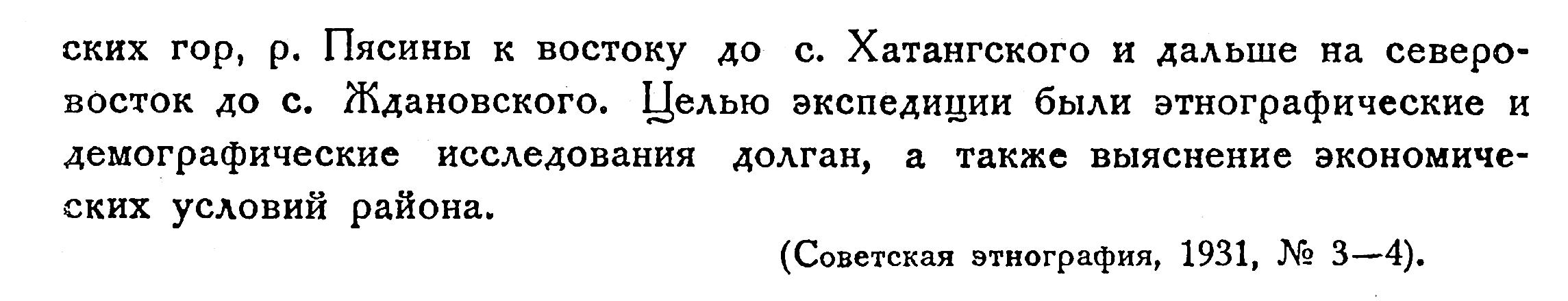 ДОЛГАНСКАЯ ЭТНОГРАФИЧЕСКАЯ ЭКСПЕДИЦИЯ КОМИССИИ ЭКСПЕДИЦИОННЫХ ИССЛЕДОВАНИЙ АКАДЕМИИ НАУК, работавшая под общим руководством проф. В. Г. Тана, обследовала в 1930—1931 гг. район Норильских гор, р. Пясины к востоку до с. Хатангского и дальше на северо-восток до с. Ждановского. Целью экспедиции были этнографические и демографические исследования долган, а также выяснение экономических условий района.