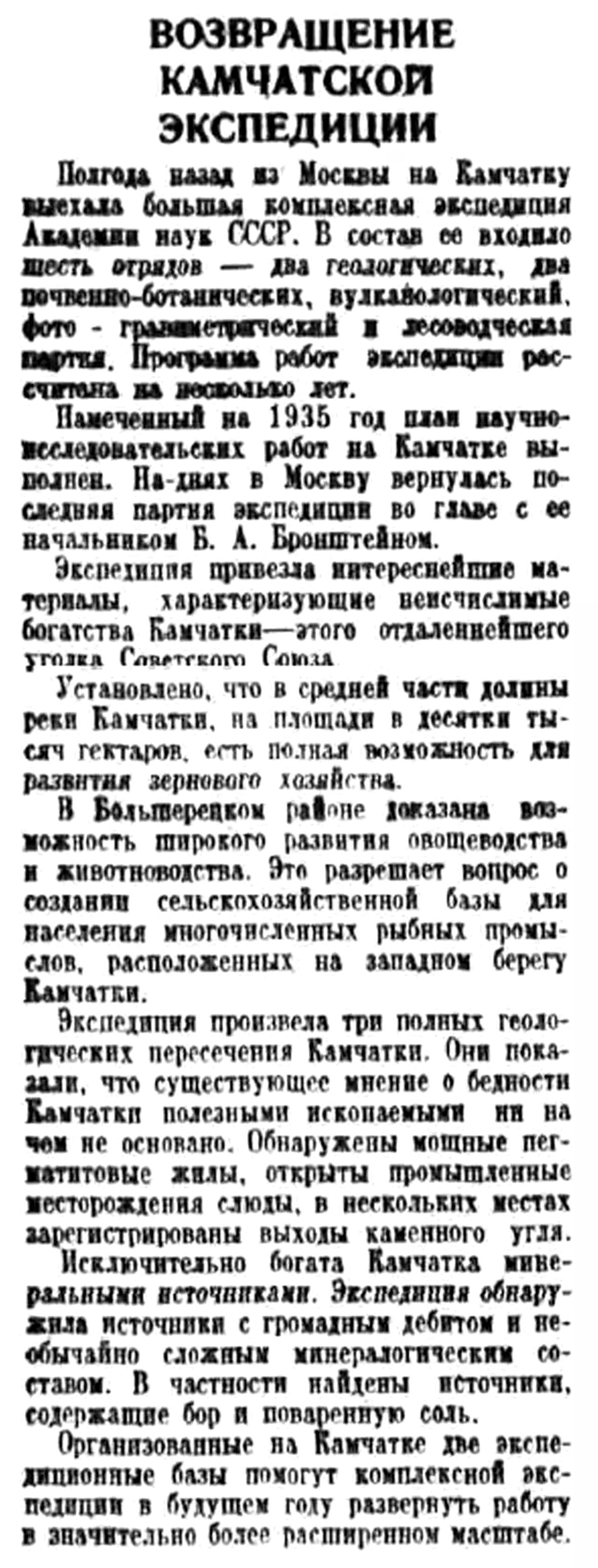 Намеченный на 1935 год план научно-исследовательских работ на Камчатке выполнен. На днях в Москву вернулась последняя партия экспедиции во главе с ее начальником Б. А. Бронштейном.