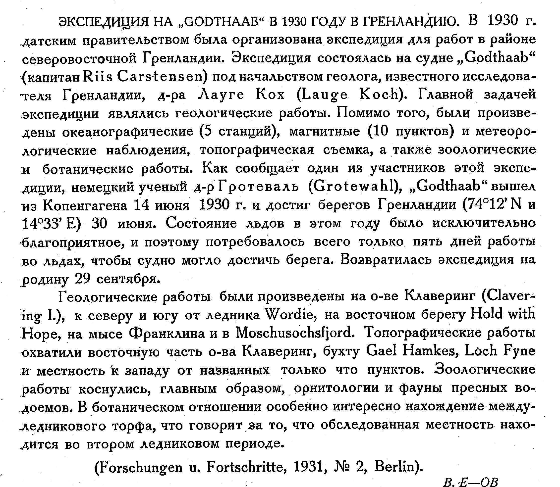 ЭКСПЕДИЦИЯ НА "GODTHAAB" В 1930 ГОДУ В ГРЕНЛАНДИЮ. В 1930 г. датским правительством была организована экспедиция для работ в районе северовосточной Гренландии. Экспедиция состоялась на судне "Godthaab" {капитан Riis Carstensen) под начальством геолога, известного исследователя Гренландии, д-ра Лауге Кох (Lauge Koch). Главной задачей экспедиции являлись геологические работы. Помимо того, были произведены океанографические (5 станций), магнитные (10 пунктов) и метеорологические наблюдения, топографическая съемка, а также зоологические и ботанические работы. Как сообщает один из участников этой экспедиции, немецкий ученый д-р Гротеваль (Grotewahl), "Godthaab" вышел из Копенгагена 14 июня 1930 г. и достиг берегов Гренландии (74°12’N и 14°33’ Е) 30 июня. Состояние льдов в этом году было исключительно благоприятное, и поэтому потребовалось всего только пять дней работы во льдах, чтобы судно могло достичь берега. Возвратилась экспедиция на родину 29 сентября.