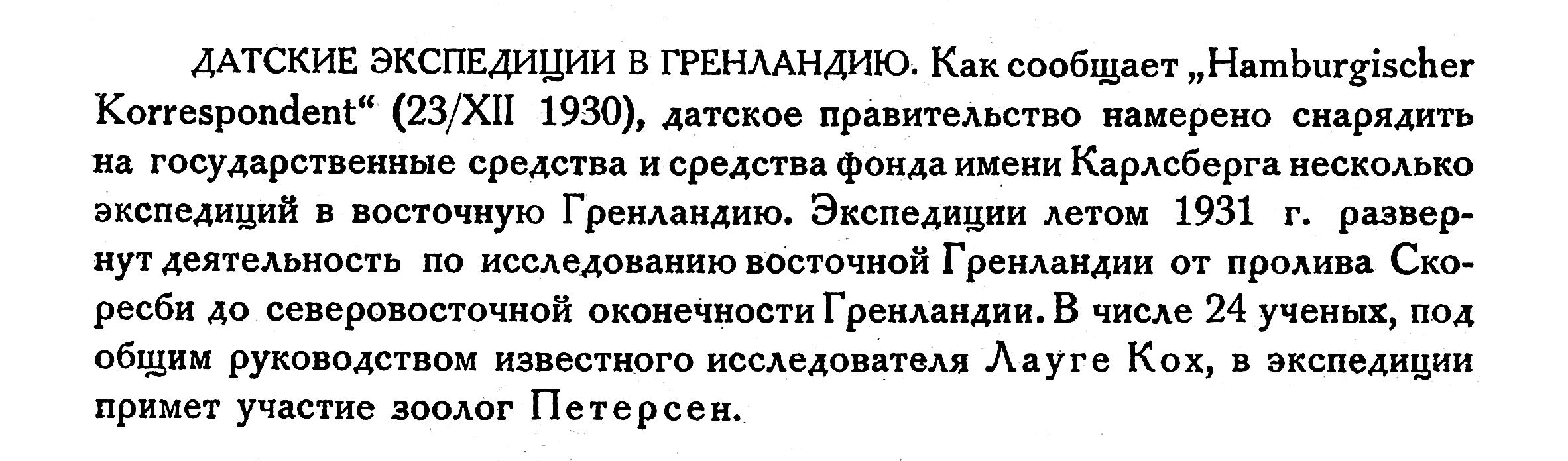 ДАТСКИЕ ЭКСПЕДИЦИИ В ГРЕНЛАНДИЮ. Как сообщает „Hamburgischer Korrespondent" (23/ХII 1930), датское правительство намерено снарядить на государственные средства и средства фонда имени Карлсберга несколько экспедиций в восточную Гренландию. Экспедиции летом 1931 г. развернут деятельность по исследованию восточной Гренландии от пролива Скоресби до северовосточной оконечности Гренландии. В числе 24 ученых, под общим руководством известного исследователя Лауге Кох, в экспедиции примет участие зоолог Петерсен.