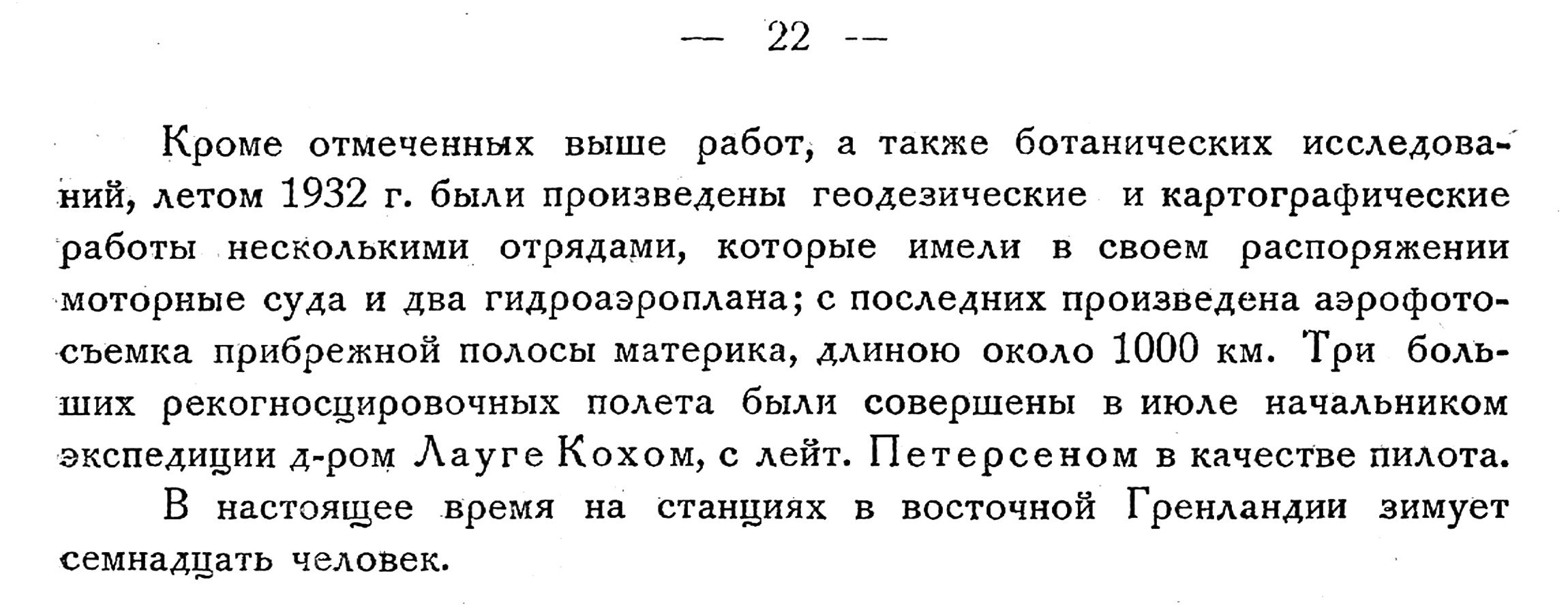 Кроме отмеченных выше работ, а также ботанических исследований, летом 1932 г. были произведены геодезические и картографические работы несколькими отрядами, которые имели в своем распоряжении моторные суда и два гидроаэроплана; с последних произведена аэрофотосъемка прибрежной полосы материка, длиною около 1000 км. Три больших рекогносцировочных полета были совершены в июле начальником экспедиции д-ром Лауге Кохом, с лейт. Петерсеном в качестве пилота.