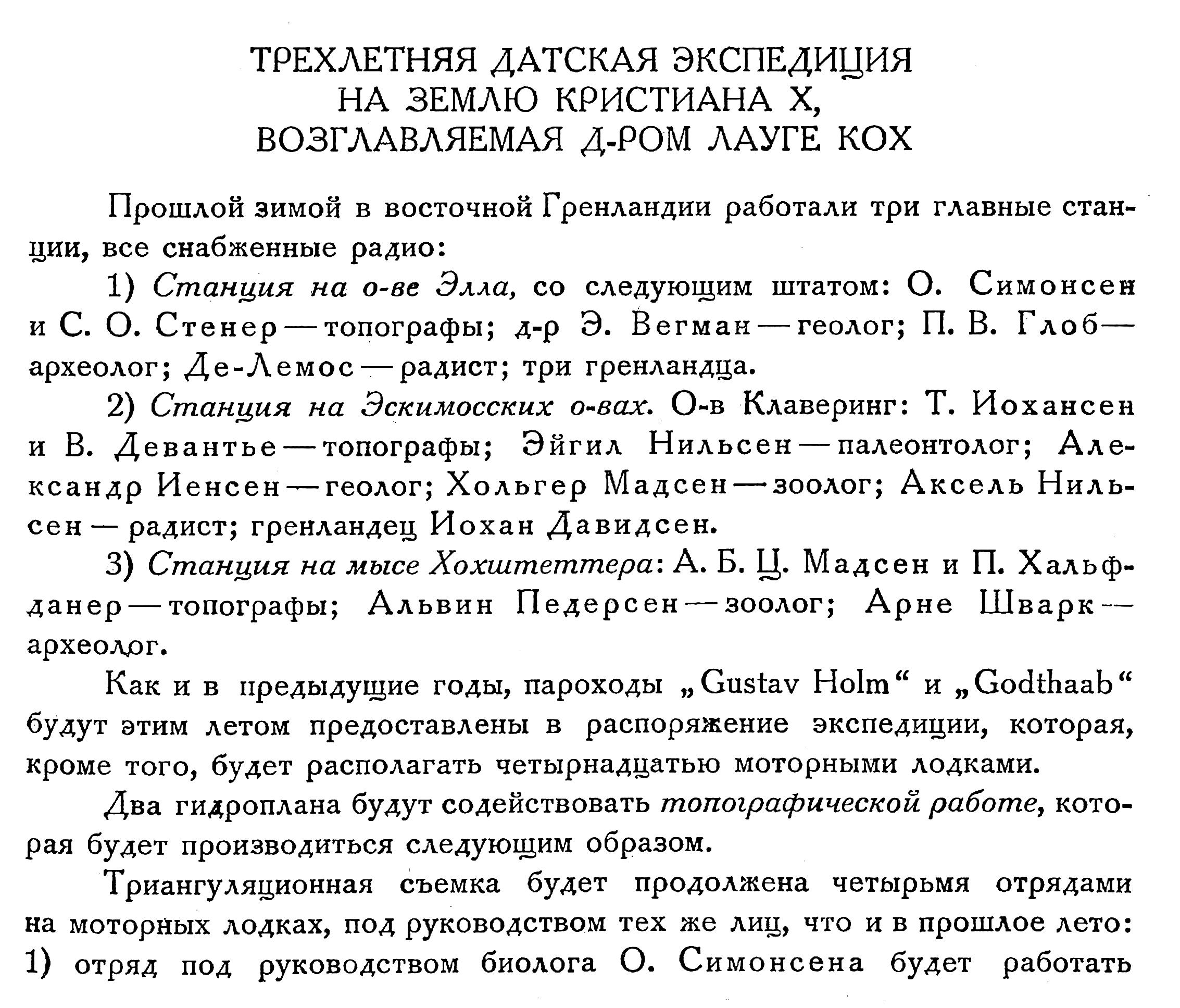 16 июня из Копенгагена в северовосточную Гренландию на двух судах („Gustav Holm“ и ,,Godthaab“) вышла научная экспедиция в составе 66 человек, под начальством д-ра Лауге Коха (Lauge Koch). Экспедиция, рассчитанная на три года, везет с собой 2 больших дома, 8 моторных катеров и 54 собаки. Главной задачей экспедиции является производство топографических, геологических, зоологических, ботанических, океанографических и этнографических работ.
