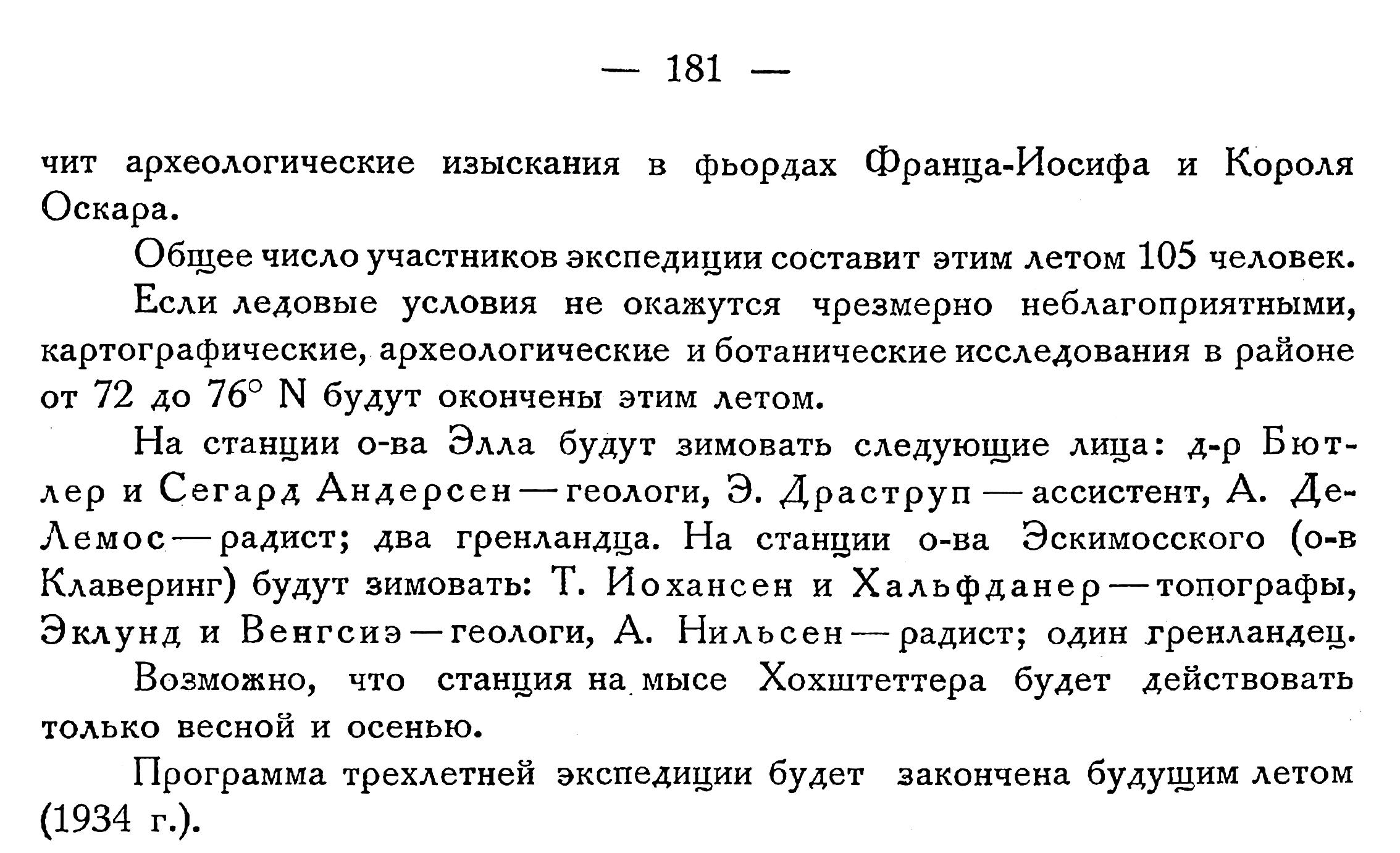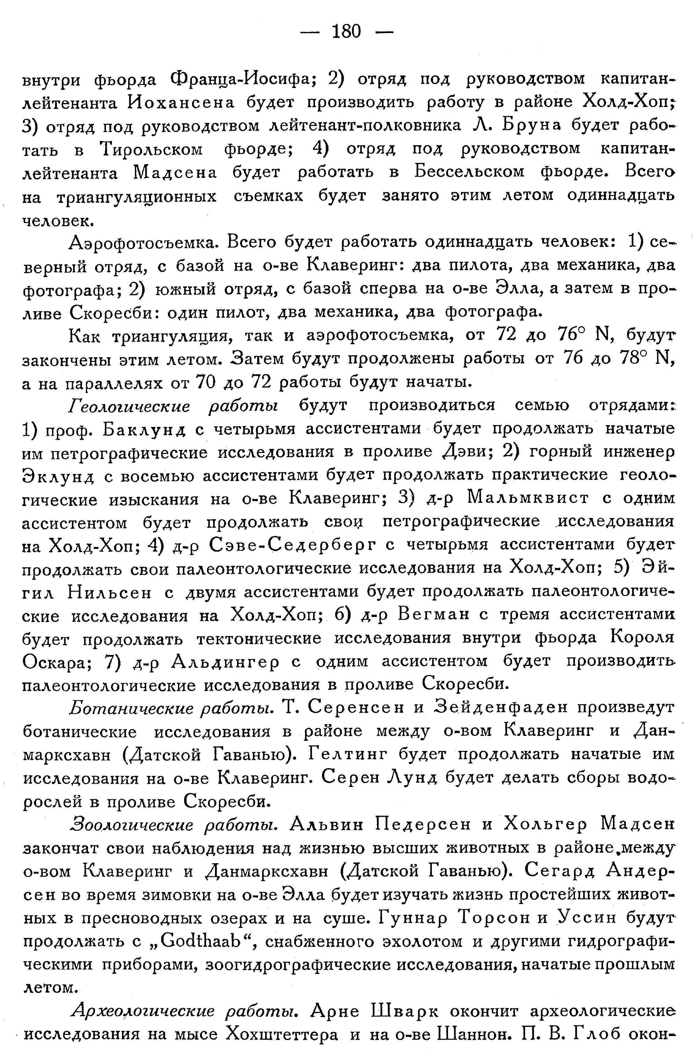 В 1932 г. объем летних работ, по сравнению с предыдущим годом, был заметно расширен по группам: одной, состоявшей из петрографов-специалистов, под руководством проф. Баклунда и д-ра Мальмквиста (Упсала), и двум палеонтологическим — под руководством Седерберга (Стокгольм) и Эйгеля Нильсена (Копенгаген).