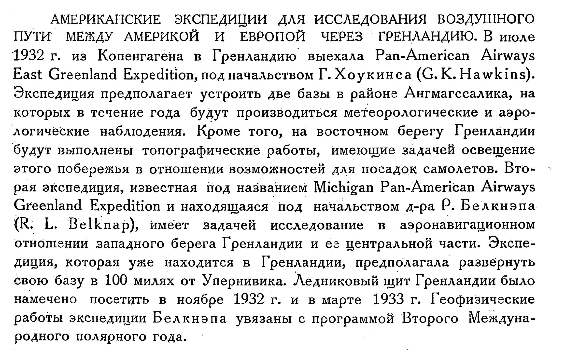 АМЕРИКАНСКИЕ ЭКСПЕДИЦИИ ДЛЯ ИССЛЕДОВАНИЯ ВОЗДУШНОГО ПУТИ МЕЖДУ АМЕРИКОЙ И ЕВРОПОЙ ЧЕРЕЗ ГРЕНЛАНДИЮ. В июле 1932 г. из Копенгагена в Гренландию выехала Pan-American Airways East Greenland Expedition, под начальством Г. Хоукинса (G. К. Hawkins). Экспедиция предполагает устроить две базы в районе Ангмагссалика, на которых в течение года будут производиться метеорологические и аэрологические наблюдения. Кроме того, на восточном берегу Гренландии будут выполнены топографические работы, имеющие задачей освещение этого побережья в отношении возможностей для посадок самолетов. Вторая экспедиция, известная под названием Michigan Pan-American Airways Greenland Expedition и находящаяся под начальством д-ра Р. Белкнэпа (R. L. Belknap), имеет задачей исследование в аэронавигационном отношении западного берега Гренландии и ее центральной части. Экспедиция, которая уже находится в Гренландии, предполагала развернуть свою базу в 100 милях от Упернивика. Ледниковый щит Гренландии было намечено посетить в ноябре 1932 г. и в марте 1933 г. Геофизические работы экспедиции Белкнэпа увязаны с программой Второго Международного полярного года.