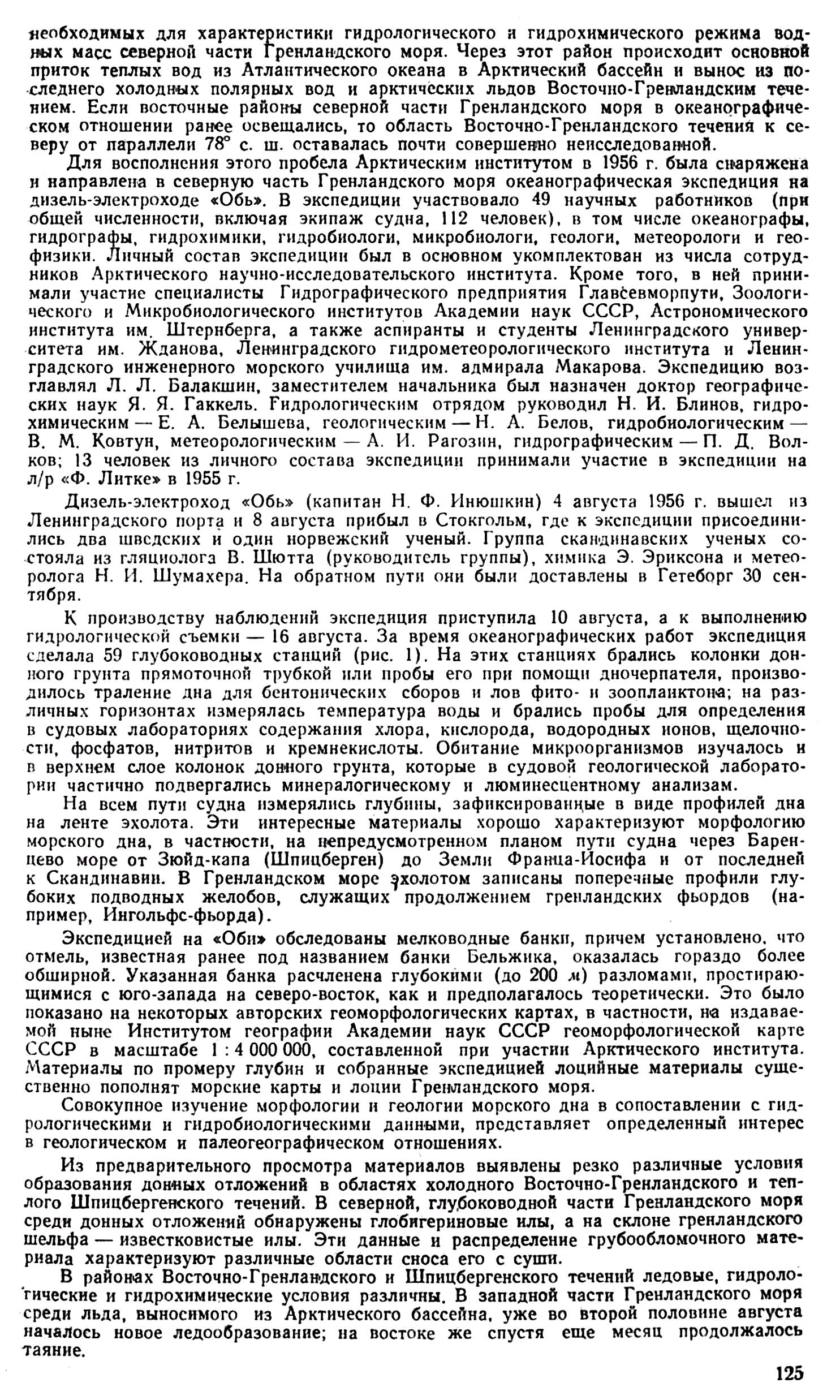 Для восполнения этого пробела Арктическим институтом в 1956 г. была снаряжена н направлена в северную часть Гренландского моря океанографическая экспедиция на дизель-электроходе «Обь». В экспедиции участвовало 49 научных работников (при общей численности, включая экипаж судна, 112 человек), в том числе океанографы, гидрографы, гидрохимики, гидробиологи, микробиологи, геологи, метеорологи и геофизики. Личный состав экспедиции был в основном укомплектован из числа сотрудников Арктического научно-исследовательского института. Кроме того, в ней принимали участие специалисты Гидрографического предприятия Главсевморпути, Зоологического и Микробиологического институтов Академии наук СССР, Астрономического института им. Штернберга, а также аспиранты и студенты Ленинградского университета им. Жданова, Ленинградского гидрометеорологического института и Ленинградского инженерного морского училища им. адмирала Макарова. Экспедицию возглавлял Л. Л. Балакшин, заместителем начальника был назначен доктор географических наук Я. Я. Гаккель. Гидрологическим отрядом руководил Н. И. Блинов, гидрохимическим — Е. А. Белышева, геологическим — Н. А. Белов, гидробиологическим — В. М. Ковтун, метеорологическим — А. И. Рагозин, гидрографическим — П. Д. Волков; 13 человек из личного состава экспедиции принимали участие в экспедиции на л/р «Ф. Литке» в 1955 г.