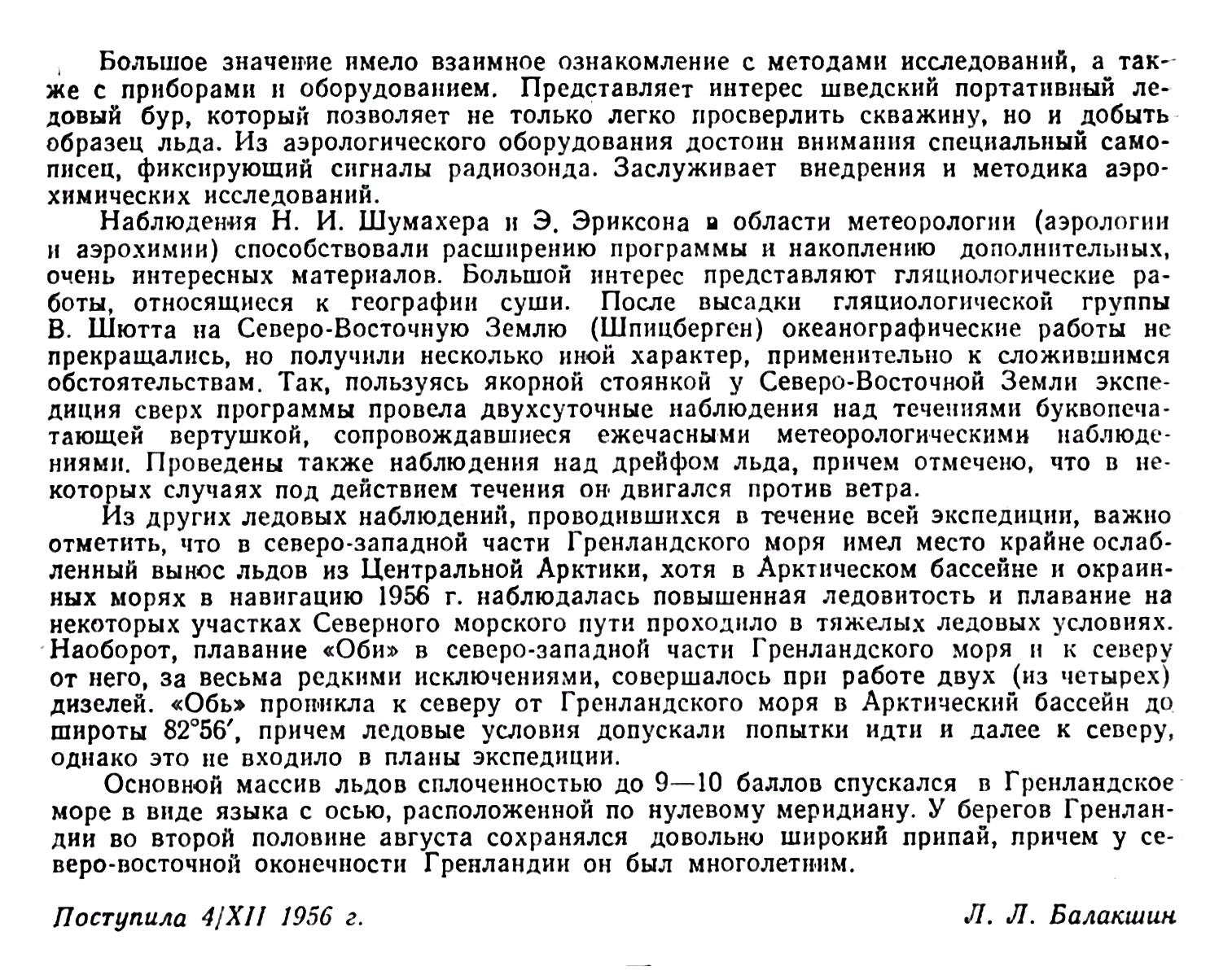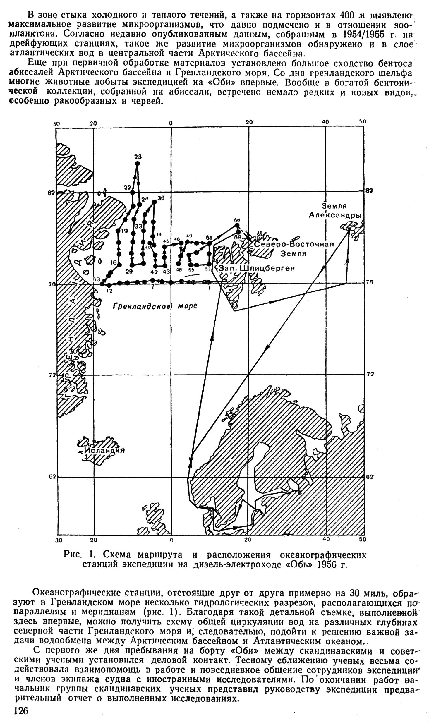 Из других ледовых наблюдений, проводившихся в течение всей экспедиции, важно отметить, что в северо-западной части Гренландского моря имел место крайне ослабленный вынос льдов из Центральной Арктики, хотя в Арктическом бассейне и окраинных морях в навигацию 1956 г. наблюдалась повышенная ледовитость и плавание на некоторых участках Северного морского пути проходило в тяжелых ледовых условиях. Наоборот, плавание «Оби» в северо-западной части Гренландского моря и к северу от него, за весьма редкими исключениями, совершалось при работе двух (из четырех) дизелей. «Обь» проникла к северу от Гренландского моря в Арктический бассейн до широты 82°56', причем ледовые условия допускали попытки идти и далее к северу, однако это не входило в планы экспедиции.