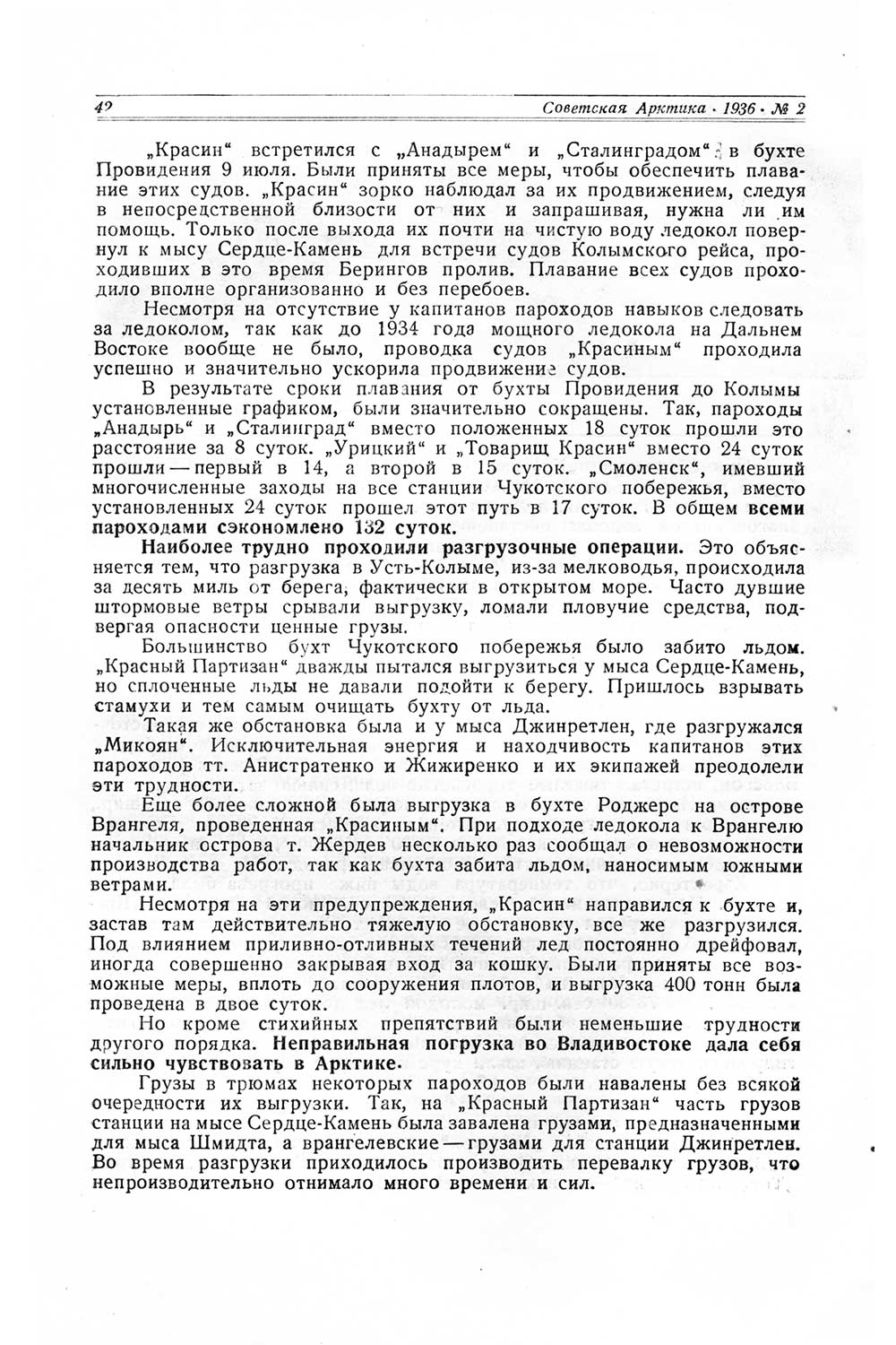 Несмотря на отсутствие у капитанов пароходов навыков следовать за ледоколом, так как до 1934 года мощного ледокола на Дальнем Востоке вообще не было, проводка судов „Красиным" проходила успешно и значительно ускорила продвижение судов.