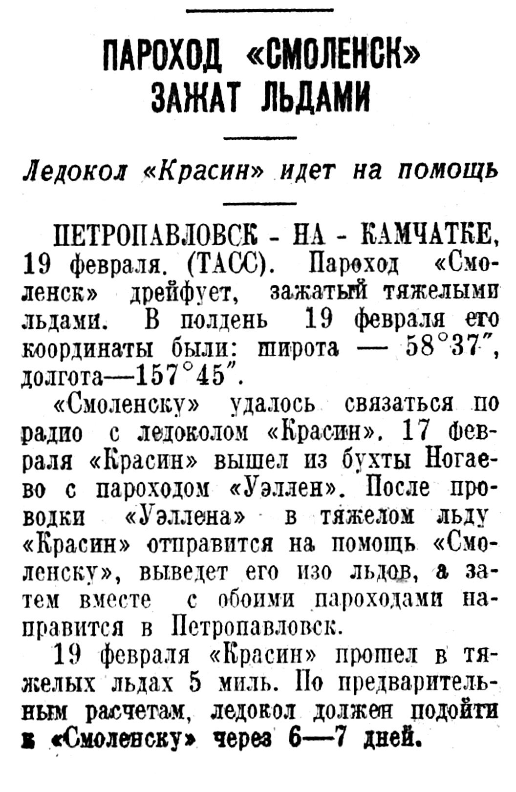 ПЕТРОПАВЛОВСК - НА - КАМЧАТКЕ, 19 февраля. (ТАСС). Пароход «Смоленск» дрейфует, зажатый тяжелыми льдами. В полдень 19 февраля его координаты были: широта — 58°37", долгота — 157 °45".