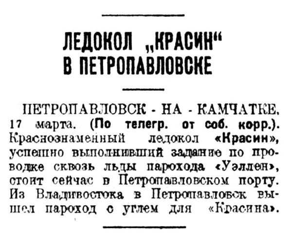 Краснознаменный ледокол «Красин», успешно выполнивший задание по проводке сквозь льды парохода «Уэллен», стоит сейчас в Петропавловском порту. Из Владивостока в Петропавловск вышел пароход с углем для «Красина».