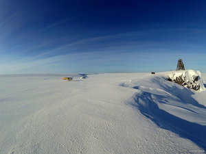 Перед самым основанием мыска, где стоит знак приличная расщелина. Сейчас она засыпана снегом и я могу вплотную подойти к небольшой площадке. Рядом со мной в тишине солнечного дня дышит море покрытое местами ледком, местами открытой водой и нагромождениями торосов.