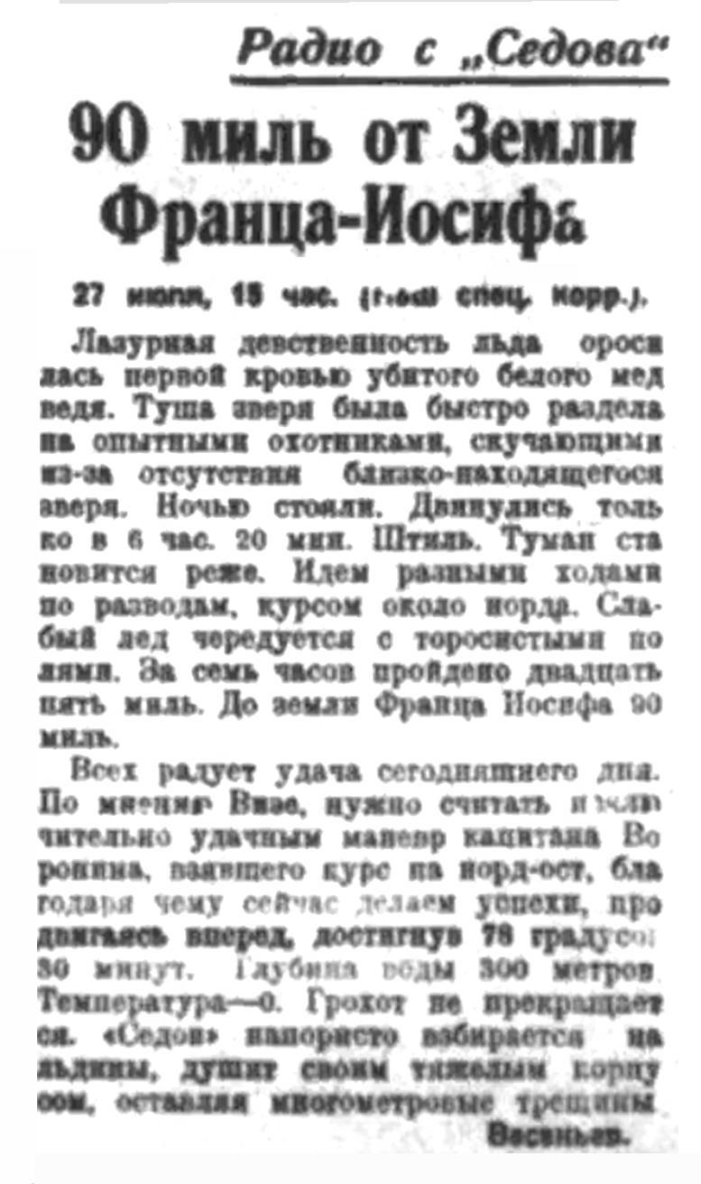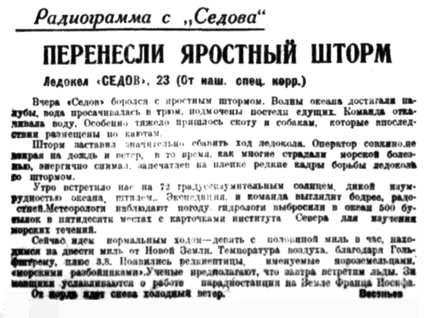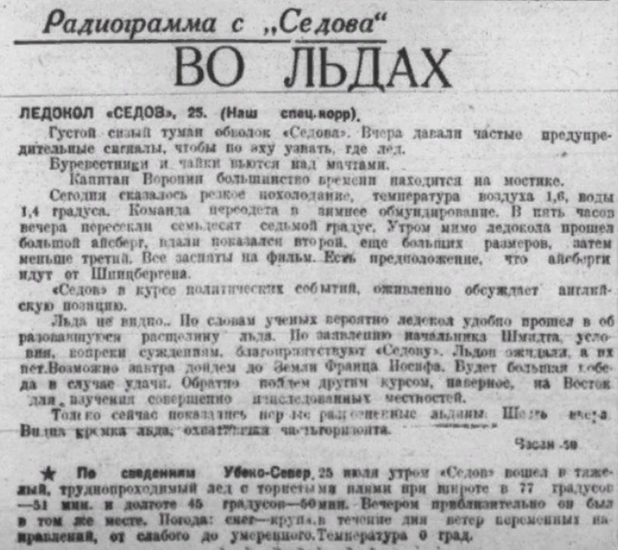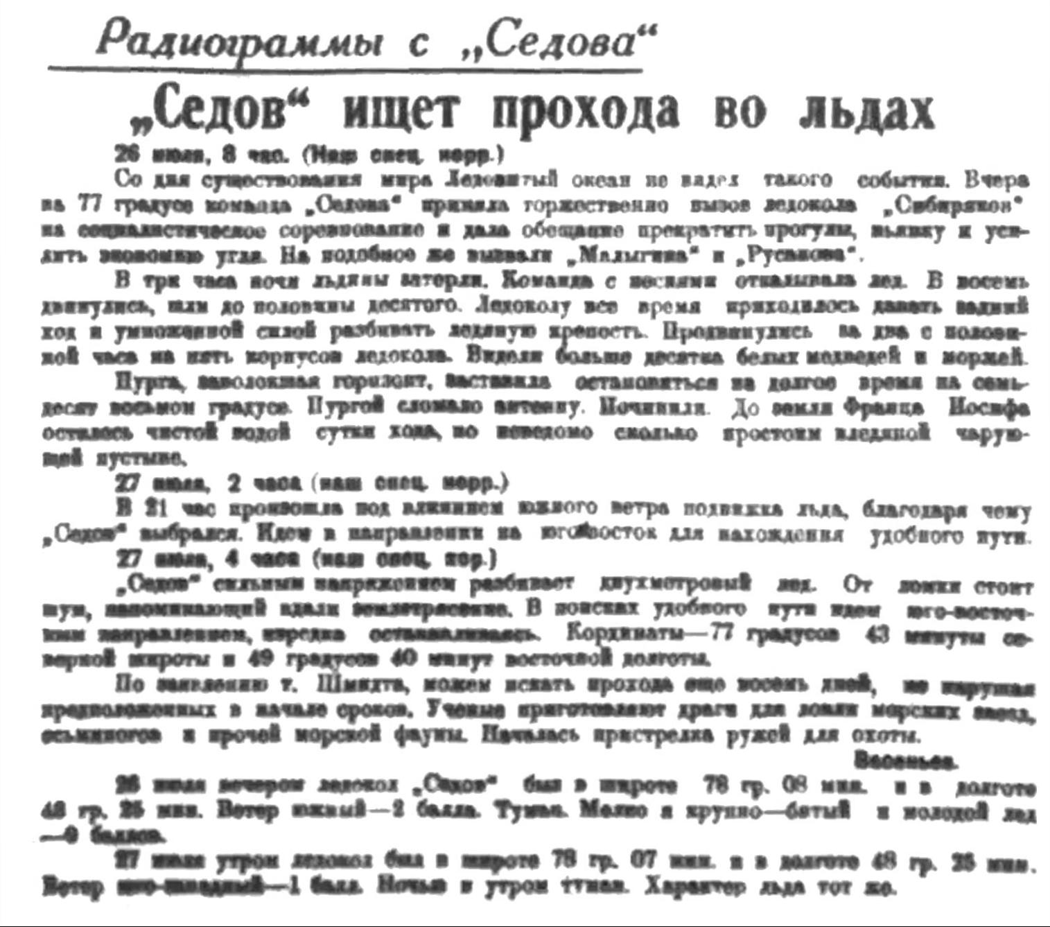 Со дня существования мира Ледовитый океан не видел такого события. Вчера на 77 градусе команда "Седова" приняла торжественно вызов ледокола "Сибиряков" на социалистическое соревнование и дала обещание прекратить прогулы, пьянку и усилить экономию угля. На подобное же вызвали "Малыгина" и "Русанова".