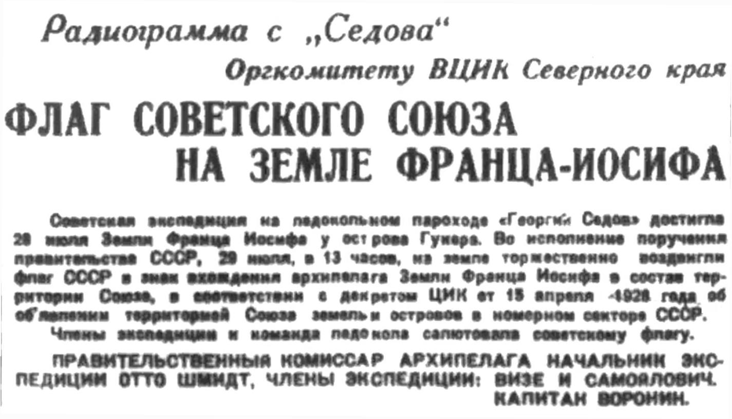Советская экспедиция на ледокольном пароходе "Георгий Седов" достигла 28 июля Земли Франца Иосифа у острова Гукера. Во исполнение поручения правительства СССР, 29 июля, в 13 часов, на земле торжественно воздвигли флаг СССР в знак вхождения архипелага Земля Франца Иосифа в состав территории Союза, в соответствии с декретом ЦИК от 15 апреля 1928 года об объявлении территорией Союза земель и островов в полярном секторе СССР. Члены экспедиции и команда ледокола салютовали советскому флагу.