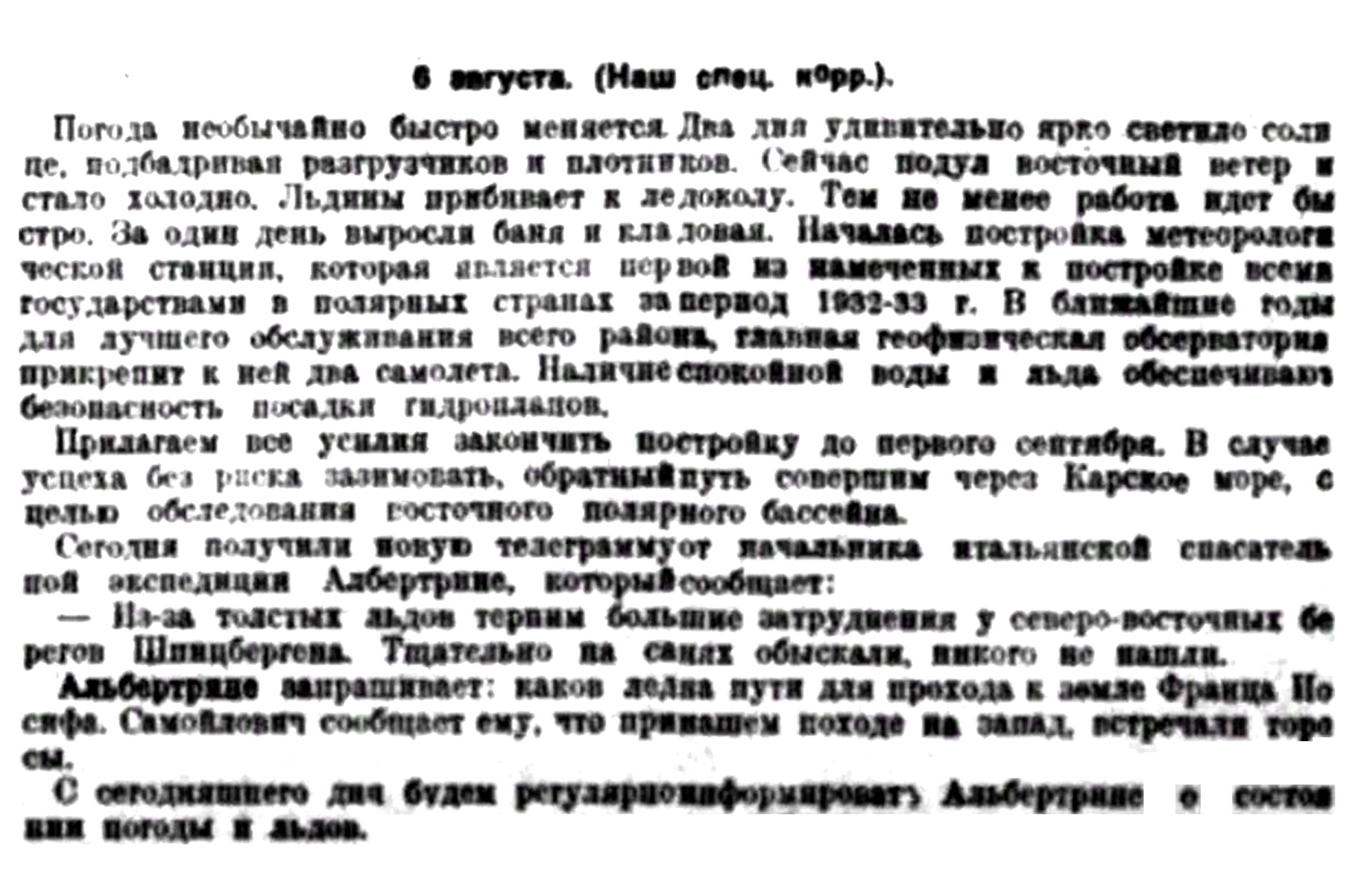Погода необычайно быстро меняется. Два дня удивительно ярко светило солнце, подбадривая разгрузчиков и плотников. Сейчас подул восточный ветер и стало холодно. Льдины прибивает к ледоколу. Тем не менее работа идет быстро. За один день выросла баня и кладовая. Началась построка метеорологической станции, которая является первой из намеченных к постройке всеми государствами в в полярных странах за период 1932-3З г. В ближайшие годы для лучшего обслуживания всего района, главная геофизическая обсерватория прикрепит к ней два самолета. Наличие спокойной воды и льда обеспечивают безопасность посадки гидропланов.