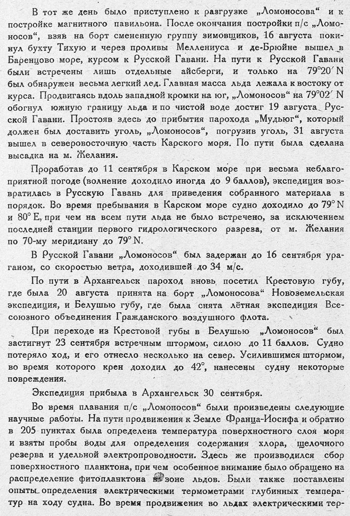 По пути в Архангельск пароход вновь посетил Крестовую губу, где была 20 августа принята на борт „Ломоносова" Новоземельская экспедиция, и Белушью губу, где была снята лётная экспедиция Всесоюзного объединения Гражданского воздушного флота.