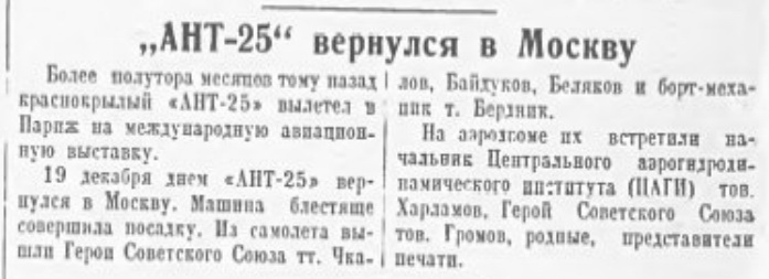 Учитывая это, Народный комиссариат тяжелой промышленности в лице наркома т. Орджоникидзе, считая задание правительства выполненным, дал приказание прекратить полет и произвести посадку, что и было блестяще выполнено экипажем самолета.
