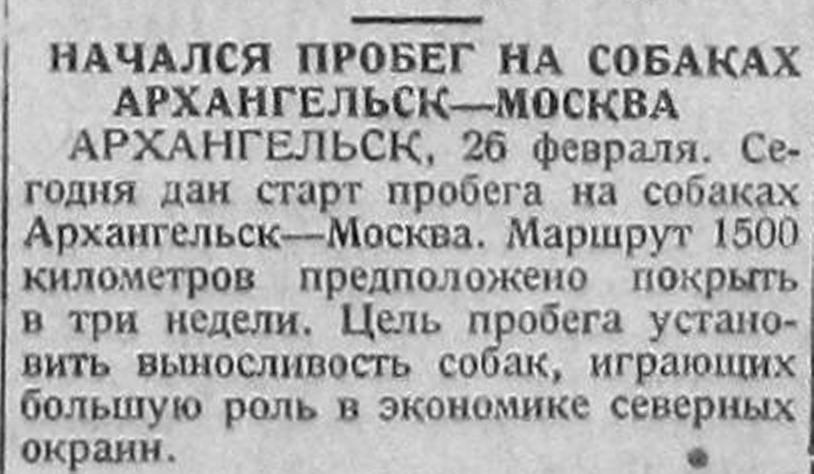 В 1930 - 1932 годах в СССР состоялась целая серия пробегов на собачьих упряжках. В феврале 1933 года Ленинградский совет ОСОАВИАХИМа решил провести звездный пробег, посвященный 25-й годовщине РККА. 35 упряжкам, состоящим из более 300 собак, предстояло совершить одновременный переход из Мурманска, Ленинграда, Боровичей, Харькова, Ярославля, Горького, Магнитогорска и ряда других городов, финишировав в Москве. Таймырская гидрографическая экспедиция выставила для участия в пробеге свою команду, оснащенную легкими нартами. Морякам предстояло преодолеть путь от Ленинград до Москвы. Упряжка гидрографов состояла из шести собак - северных и восточных лаек. Две из них - одиннадцатимесячные щенки - были доставлены с острова Диксон специально для участия в пробеге.