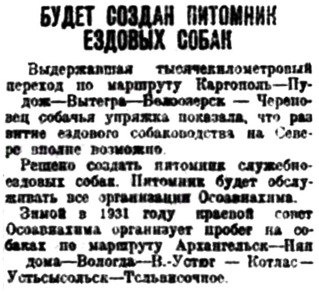 30-е годы прошлого столетия ознаменовались активным освоением Советским Союзом арктических широт. Не последняя роль в этом деле отводилась военным морякам-гидрографам. Для проведения исследований на центральном участке трассы Северного морского пути, а также на его побережье была создана Таймырская гидрографическая экспедиция Управления военно-морских сил РККА. Морякам экспедиции предстояло выполнить в высоких широтах множество работ, при этом не исключалась возможность зимовок. Несмотря на то что советская промышленность вооружила своих первопроходцев ледоколами, самолетами, аэросанями и другими транспортными средствами, в труднодоступных районах арктического побережья оставалось актуальным использование собачьих упряжек.
