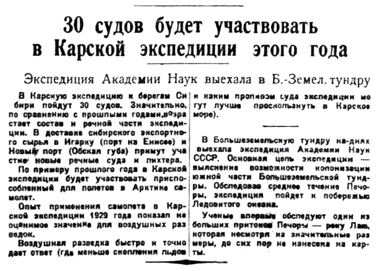 Академия Наук сообщила Комитету Севера, что летом 1930 года она посылает в Северный край две ботанических экспедиции. Обе экспедиции будут работать в Большеземельской тундре. Первая экспедиция обследует реку Лаю от истоков до устья, затем направится вдоль берегов речки Черной вплоть до впадения ее в океан. Вторая экспедиция выедет из Архангельска в низовья Печоры. Она будет изучать характер почв и растительности.