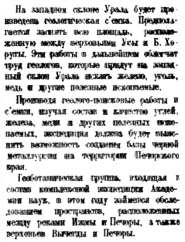 Геоботаническая группа, входящая в состав комплексной экспедиции Академии наук, в это году займется обследованием пространств, расположенных между реками Ижмы и Печоры, а также верховьев Вычегды и Печоры.