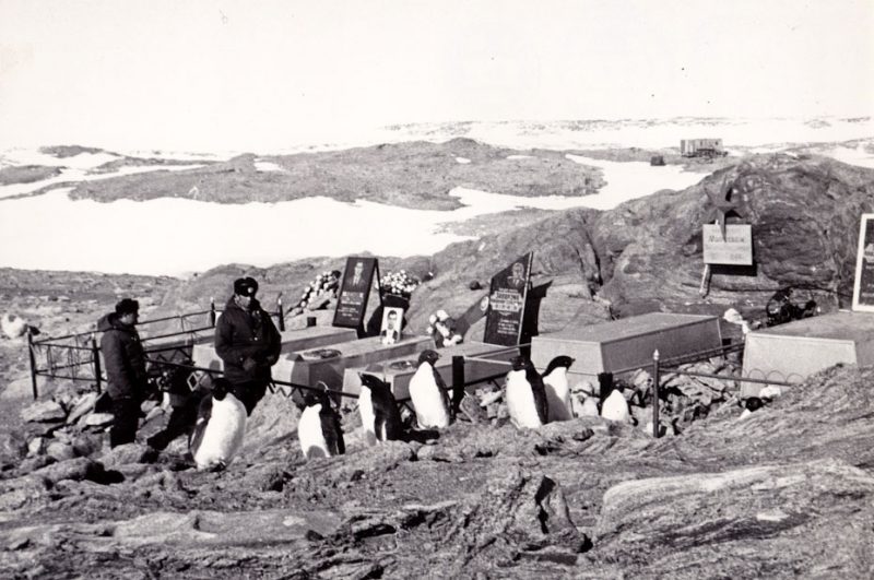 Кладбище полярников в Антарктиде. Поклониться погибшим летчикам пришли коллеги и «местные аборигены». Фото из архива В.И.Сеса -