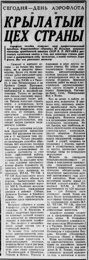 — Это подготовка самолёта и его систем к полёту. Приходилось вникать во все подробности. Так, потребовал заменить командно-топливный агрегат на гарантийном двигателе. У него 6 регулировок за полгода. Заменить исправный агрегат — это проблема с заводом. Рекламация. Добился через министерство. Дальняя связь прерывалась после отхода от точки 300 км, а надо 9 000 км. Вызвал заводских представителей, которые нашли ошибку в пайке проводов. Связался с земли во Внуково с Молодёжной и, о чудо, ответили. Нам такая связь была нужна над океаном для связи с Антарктидой и Москвой. Другая связь здесь отсутствует.