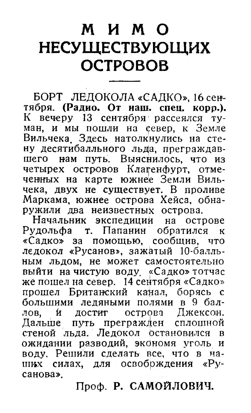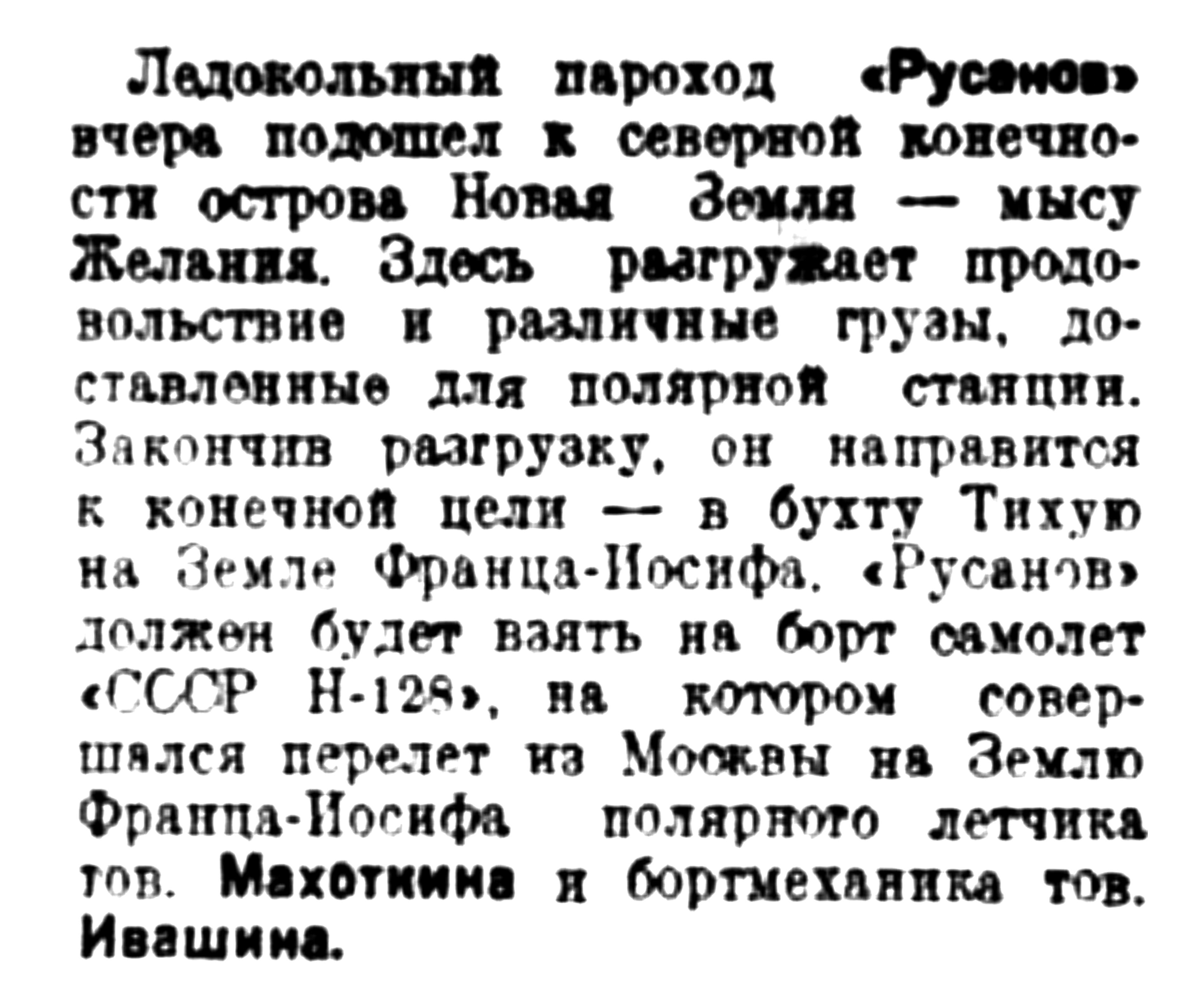 Правда Севера, 1936, № 153, 5 июля."РУСАНОВ" ИДЕТ В КАРСКОЕ МОРЕ