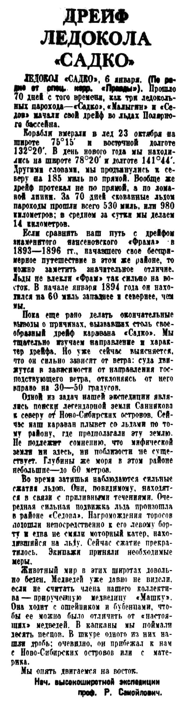 ЛЕДОКОЛ «САДКО». 8 января. (По радио. спец. корр. «Правды»). Дрейф «Садко», «Малыгина» и «Седова» продолжается. В следствии юго-западных, преобладающих, западных и частично северо-западных ветров мы с каждым днем уклоняемся все дальше на восток, в сторону района недоступности. Уже сейчас мы находимся в части Ледовитого океана, никогда до нас не посещенной. Суточный дрейф нередко превышает 10 миль.
