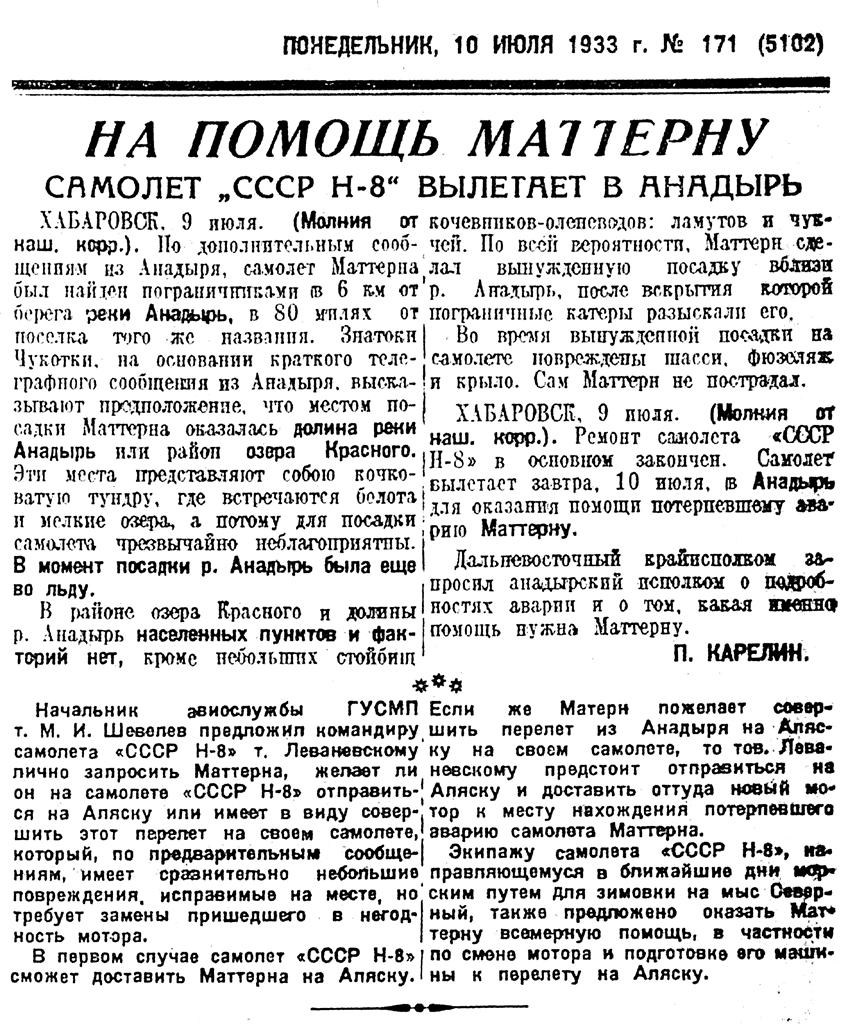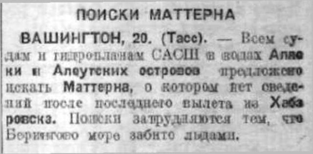 Главное управление Северного морского пути предприняло ряд мер по оказанию помощи американскому летчику Маттерну. Два мощных гидросамолета под управлением опытных в полярной работе летчиков находятся в настоящее время на пути к Чукотскому полуострову. Вышедшим из Владивостока к Берингову проливу четырем пароходам также дано задание оказать Маттерну помощь.