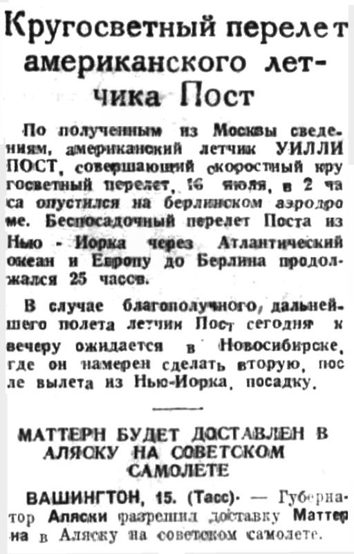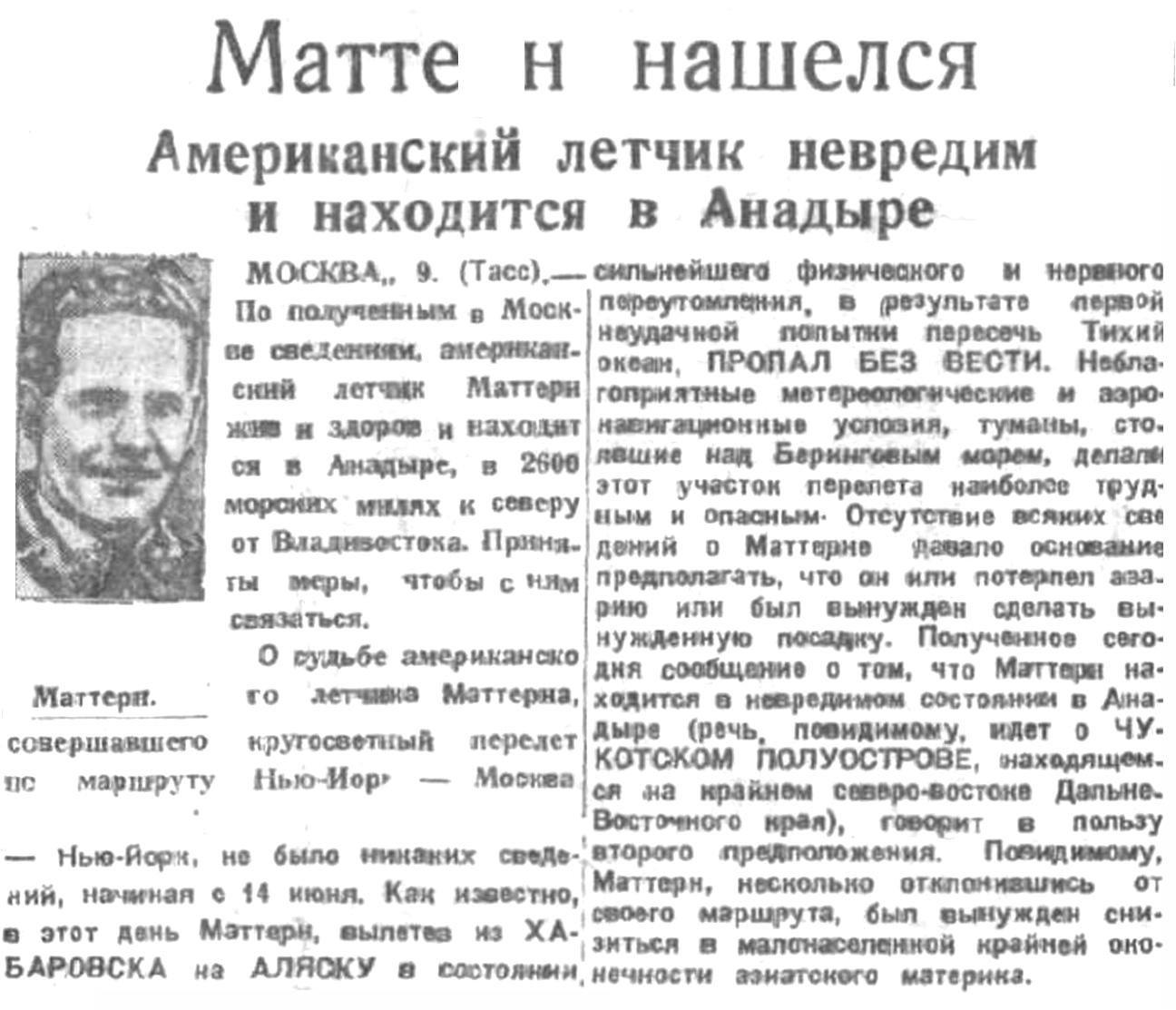 О судьбе американского летчика Маттерна, совершавшего кругосветный перелет по маршруту Нью-Йорк — Москва — Нью-Йорк, не было никаких сведений, начиная с 14 июня. Как известно, в этот день Маттерн, вылетев из ХАБАРОВСКА на АЛЯСКУ в состоянии сильнейшего физического и нервного переутомления, в результата первой неудачной попытки пересечь Тихий океан, ПРОПАЛ БЕЗ ВЕСТИ. Неблагоприятные метеорологические и аэронавигационные условия, туманы, стоявшие над Беринговым морем, делали этот участок перелета наиболее трудным и опасным. Отсутствие всяких сведений о Маттерне давало основание предполагать, что он или потерпел аварию или был вынужден сделать вынужденную посадку. Полученное сегодня сообщение о том, что Маттерн находится в невредимом состоянии в Анадыре (речь, повидимому, идет о ЧУКОТСКОМ ПОЛУОСТРОВЕ, находящемся на крайнем северо-востоке Дальне-Восточного края), говорит в пользу второго предположения. Повидимому, Маттерн, несколько отклонившись от своего маршрута, был вынужден снизиться в малонаселенной крайней оконечности азиатского материка.