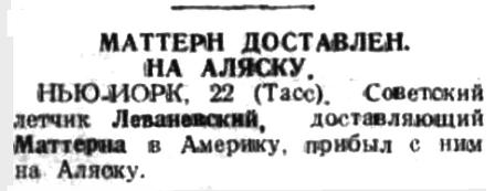Маттерн сообщил, что тяжело нагруженный самолет советского летчика тов. Леваневского, доставившего его на Аляску, восемь раз пытался подняться с Анадырской бухты. Наконец, он выбросил около 75 галлонов бензина и успешно вылетел. Ввиду тумана самолет сделал посадку на острове Лаврентия. Маттерн с т. Леваневским переночевали там. На следующий день была прекрасная погода, но когда показался берег Аляски, бензина оставалось всего на три минуты. Самолету пришлось опуститься в море. Буксирное судно доставило самолет в гавань Нома.